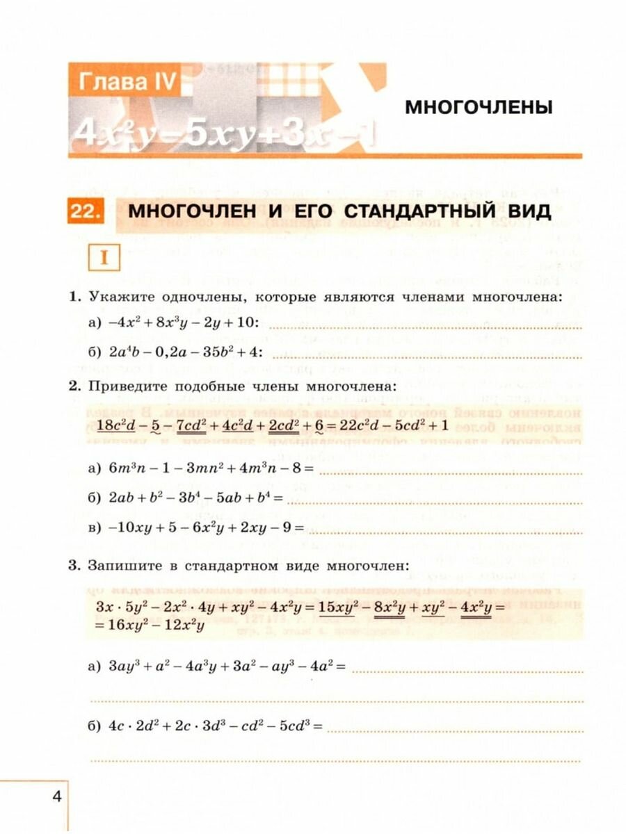 Рабочая тетрадь представлена в двух частях. В первую часть вошли работы, относящиеся к первым трём главам учебника: "Выражения, тождества, уравнения", "Функции", "Степень с натуральным показателем". Во вторую часть вошли работы, относящиеся к трём последующим главам: "Многочлены", "Формулы сокращённого умножения", "Системы линейных уравнений".