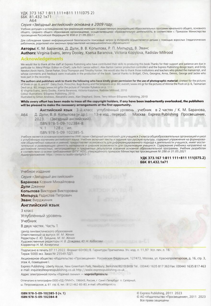 Учебник является основным компонентом УМК серии "Звёздный английский" для учащихся 3 класса общеобразовательных организаций и школ с углублённым изучением английского языка. Учебник включает тексты и задания про русскую культуру, содержит упражнения на формирование общеучебных навыков и умений, предоставляет возможность для дифференцированного подхода к деятельности учащихся, имеет воспитательную и развивающую ценность материалов и широкие возможности для социализации учащихся. Содержание учебника направлено на достижение личностных, метапредметных и предметных результатов освоения основной образовательной программы.