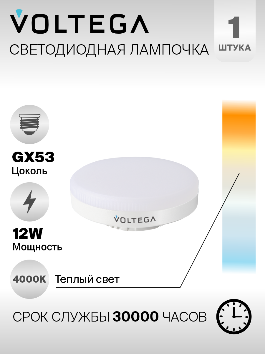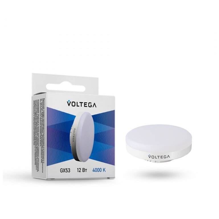 Лампа светодиодная энергосберегающая для дома Voltega .Цоколь GX53.Мощность 12 Вт. (аналог лампы накаливания 120 Вт.)Цветовая температура 4000К. (Дневной нейтральный белый свет)Угол рассеивания 100 град.Световой поток 900 Лм.Индекс цветопередачи 80 RaБелый матовый рассеиватель, форма лампы – таблетка.Серия ламп Simple GX53 12W - инновация в мире диодных LED источников освещения от Немецкой компании Voltega. Форма колбы позволяет добиться угла рассеивания света в 100 градусов, а повышенный индекс цветопередачи 80 Ra - сохраняет палитру и естественность оттенков окружения. Лампочка подойдет для светильников с цоколем GX53. Энергоэффективные диоды обеспечивают яркость свечения в 900 lm, освещая площадь 6 м2, расходуя при этом в 8 раз меньше электроэнергии. Подойдет для освещения дома и офисных помещений.Гарантия 2 года.