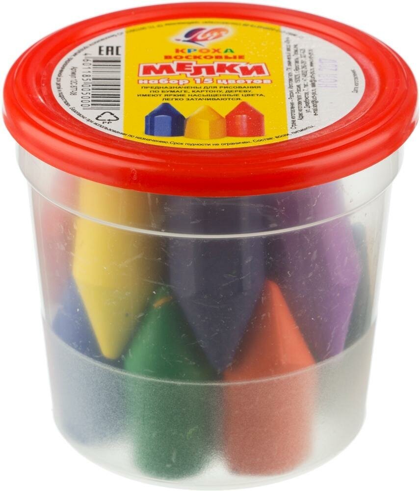 Мелки восковые в пластиковом стаканчике - универсальный набор, совмещающий в себе художественную, дидактическую и игровую функции. Набор состоит из 15 разноцветных мелков круглой, шестигранной и трехгранной формы. Мелки удобно держать в руке, так как они имеют большой диаметр. Пластиковый стаканчик создаёт удобство для хранения и использования мелков.
