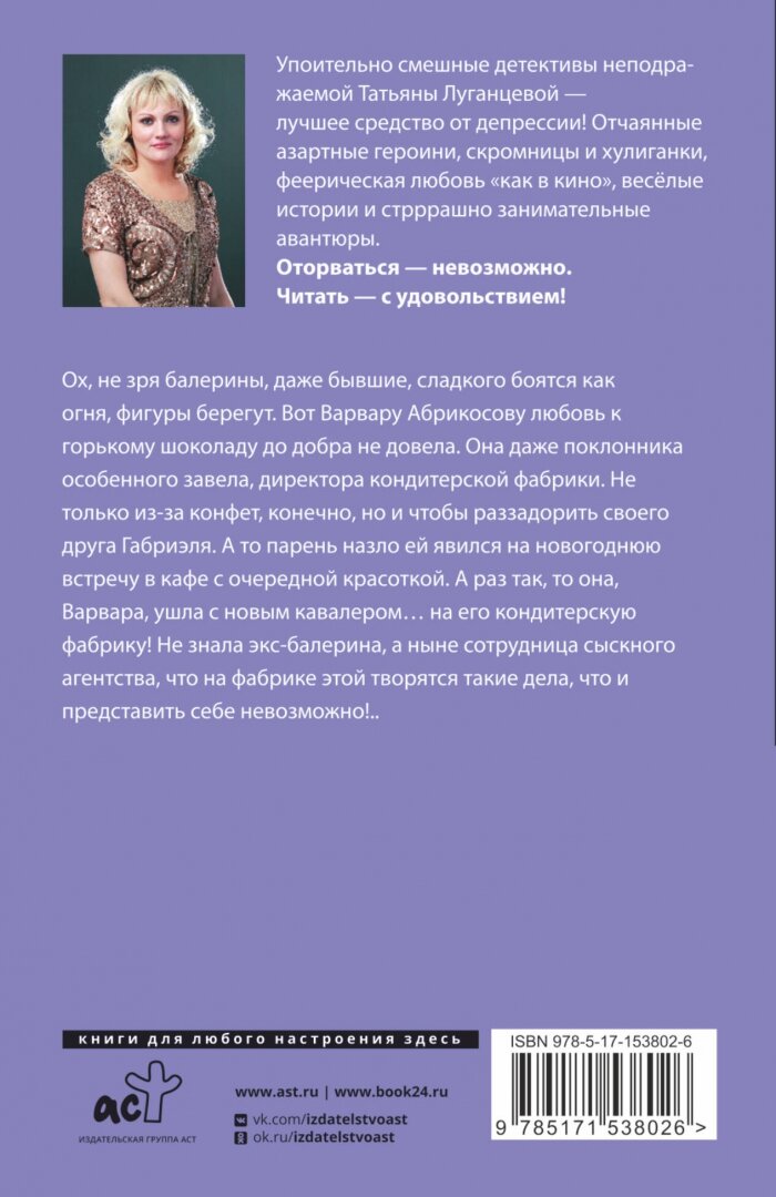 Ох, не зря балерины, даже бывшие, сладкого боятся как огня, фигуры берегут. Вот Варвару Абрикосову любовь к горькому шоколаду до добра не довела. Она даже поклонника особенного завела, директора кондитерской фабрики. Не только из-за конфет, конечно, но и чтобы раззадорить своего друга Габриэля. А то парень назло ей явился на новогоднюю встречу в кафе с очередной красоткой. А раз так, то она, Варвара, ушла с новым кавалером… на его кондитерскую фабрику! Не знала экс-балерина, а ныне сотрудница сыскного агентства, что на фабрике этой творятся такие дела, что и представить себе невозможно!..