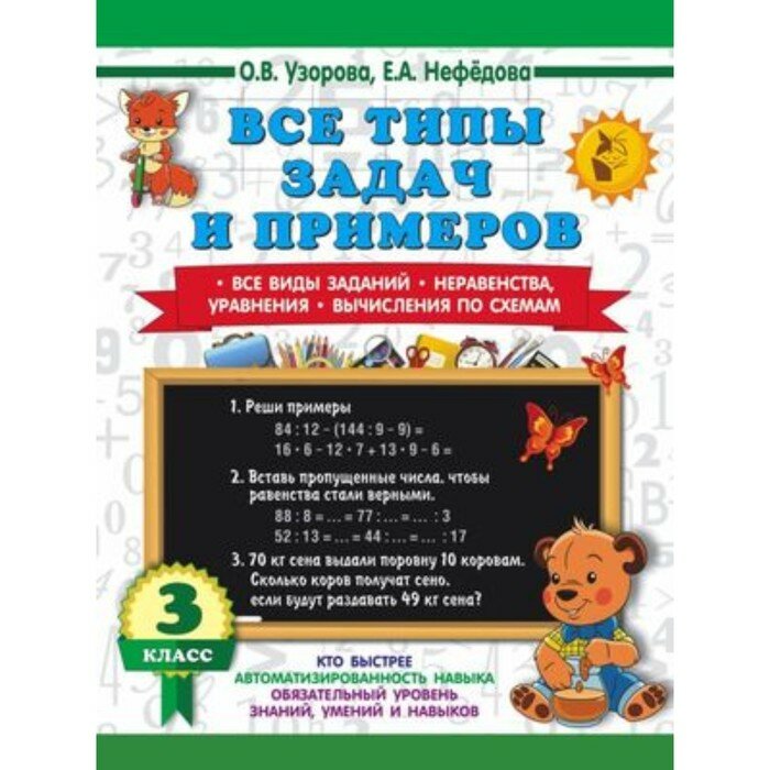 Сервис сравнения цен СкидкаГИД предлагает сравнить цены на товар «Книга: Все типы задач и примеров 3 класс. Все виды заданий. Неравенства уравнения. Вычисления по схемам (Елена Алексеевна Нефедова, Ольга Васильевна Узорова); АСТ, 2024»