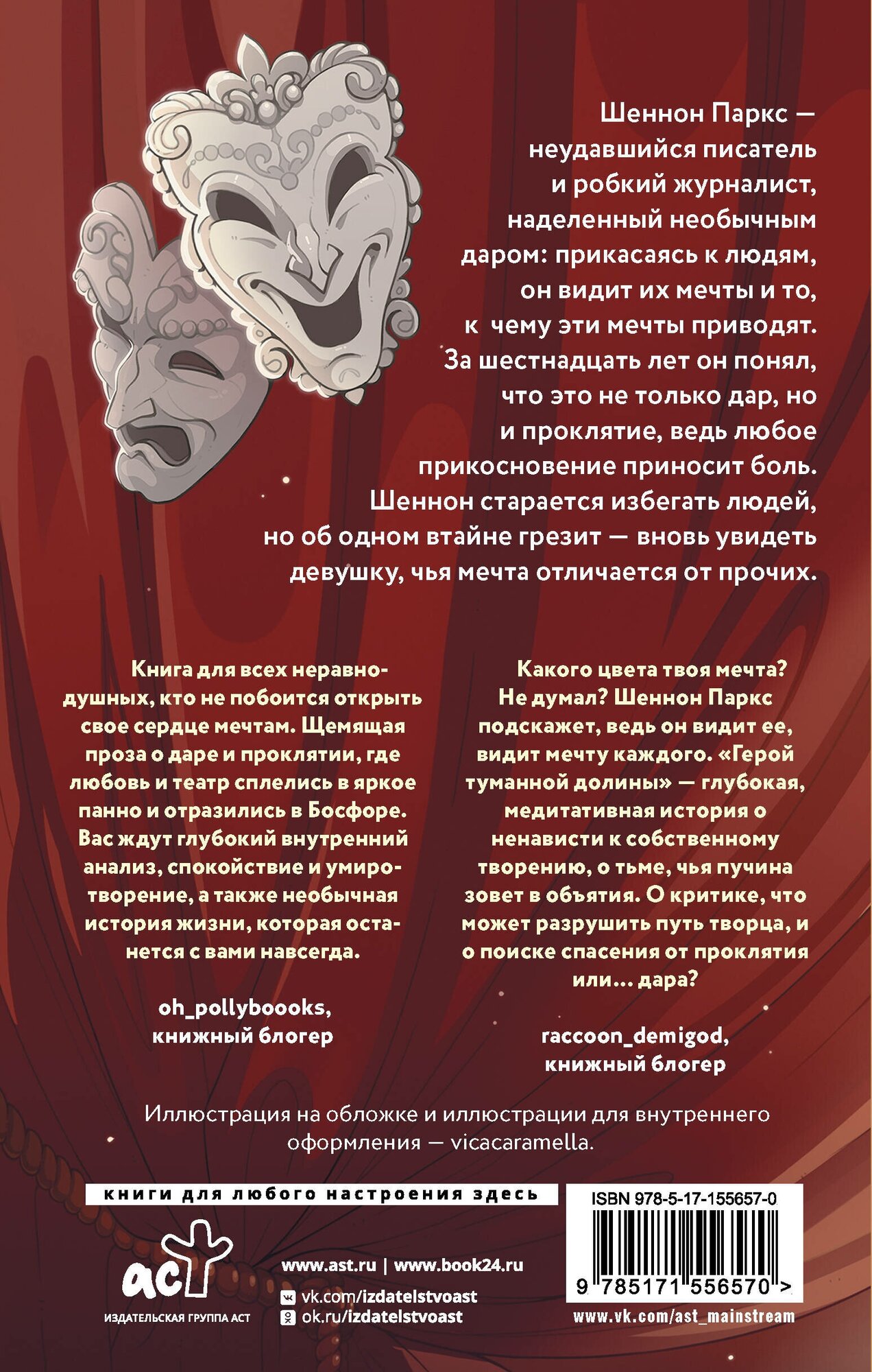 «Какого цвета твоя мечта? Не думал? Шеннон Паркс подскажет, ведь он видит ее, видит мечту каждого. «Герой туманной долины» — глубокая, медитативная история о ненависти к собственному творению, о тьме, чья пучина зовет в объятия. О критике, что может разрушить путь творца и о поиске спасения от проклятия или… дара?» (с) raccoon_demigod, книжный блогер