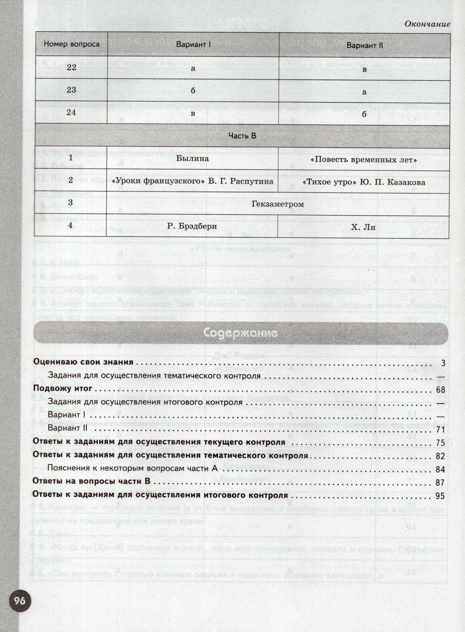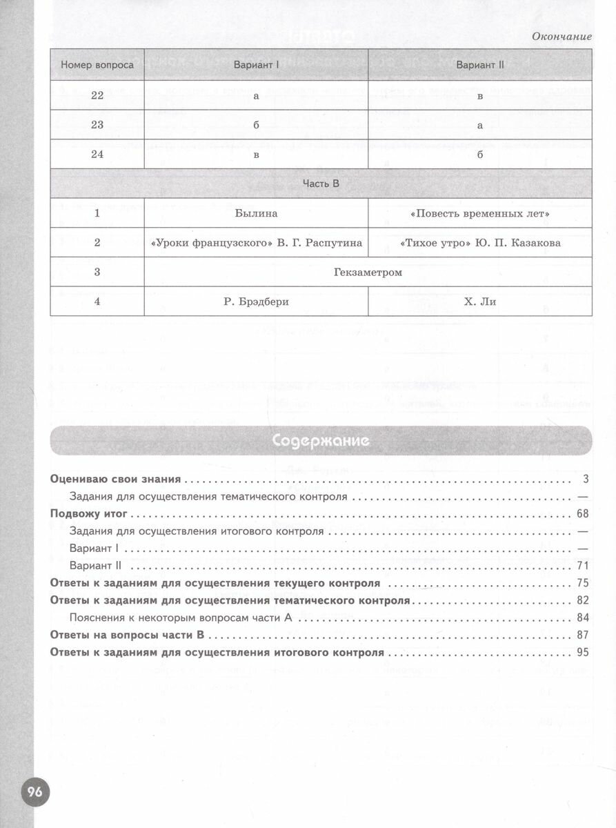 Целью данного пособия является научить шестиклассников анализировать литературное произведение, формулировать собственное отношение к нему, пересказывать произведение с использованием образных средств русского языка и цитат из текста, создавать устные и письменные высказывания разного типа, вести диалог. Тетрадь состоит из двух частей. Во вторую часть вошли разделы: "Оцениваю свои знания" (задания для осуществления тематического контроля) и "Подвожу итог" (задания для осуществления итогового контроля). Рабочая тетрадь по литературе предназначена для самостоятельной работы учащихся