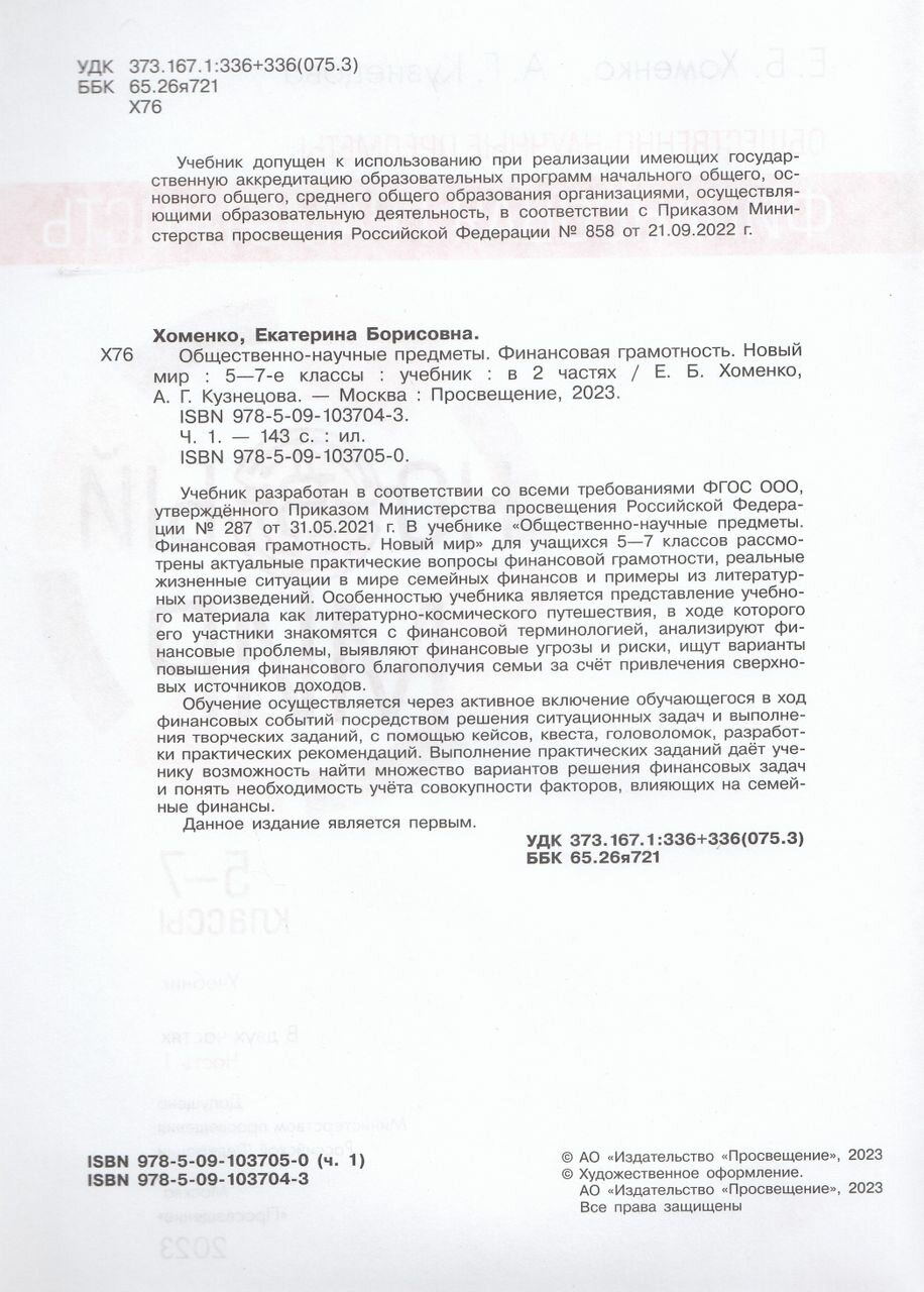 Общественно-научные предметы. Финансовая грамотность. Новый мир. 5-7 классы. Учебник. В двух частях. Часть 1 (Екатерина Борисовна Хоменко, Алевтина Георгиевна Кузнецова); Просвещение, 2025