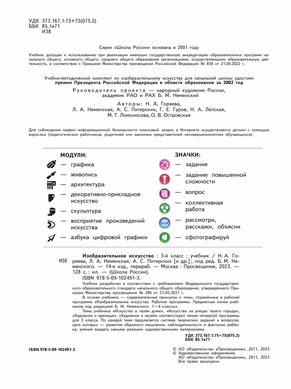 Изобразительное искусство. 3 класс. Учебник (Горяева Н.А., Неменская Л.А., Питерских А.С. и др. / Под ред. Неменского Б.М.); Просвещение, 2023