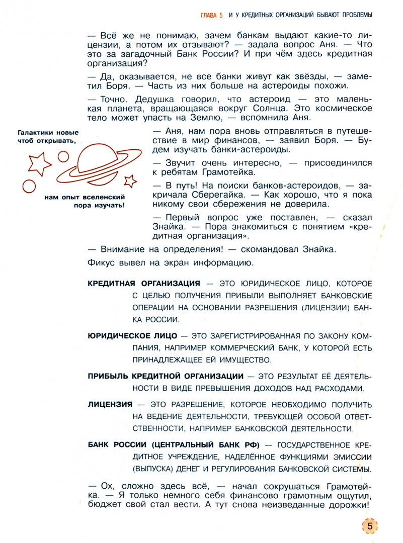 В учебнике "Общественно-научные предметы. Финансовая грамотность. Новый мир" для учащихся 5-7 классов рассмотрены актуальные практические вопросы финансовой грамотности, реальные жизненные ситуации в мире семейных финансов и примеры из литературных произведений. Особенностью учебника является представление учебного материала как литературно-космического путешествия, в ходе которого его участники знакомятся с финансовой терминологией, анализируют финансовые проблемы, выявляют финансовые угрозы и риски, ищут варианты повышения финансового благополучия семьи за счёт привлечения сверхновых источников доходов.