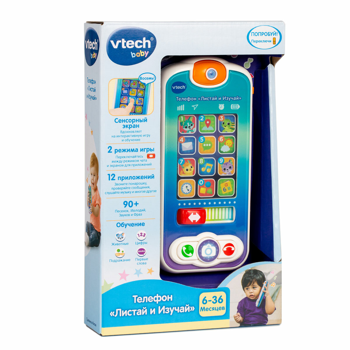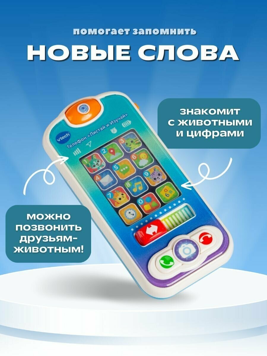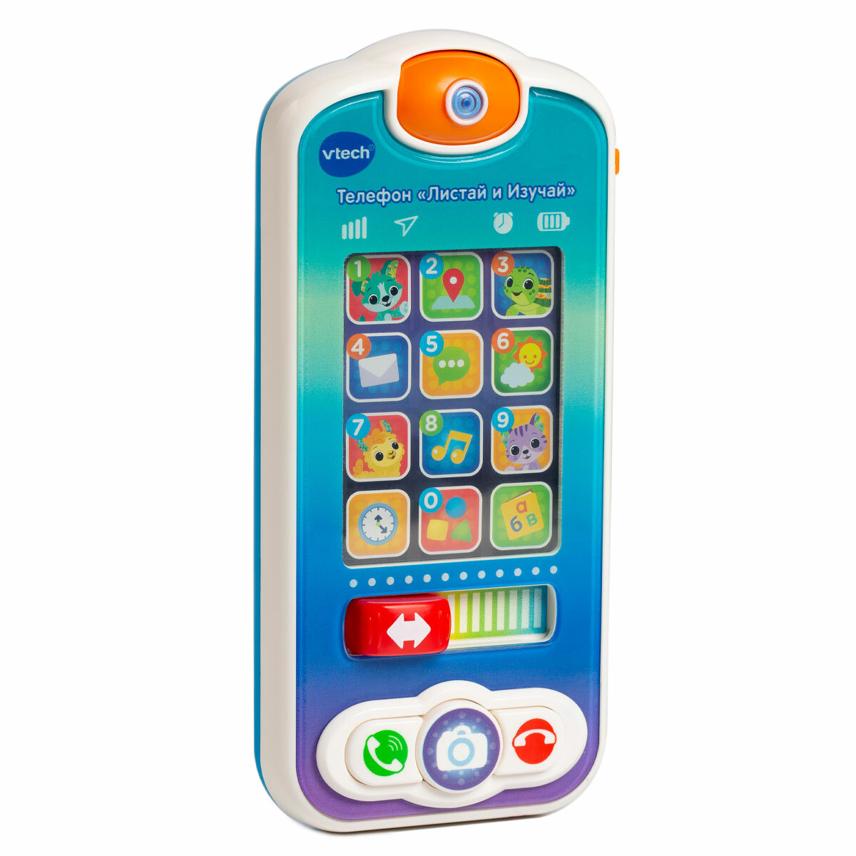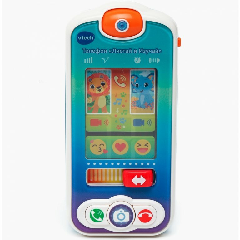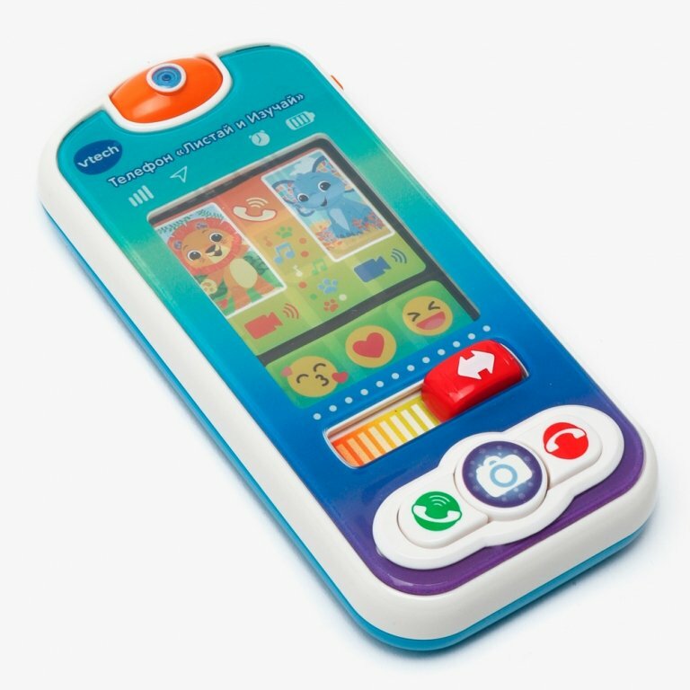 Vtech Обучение животным, цифрам, знакомство с первыми словами. Познакомить малыша с миром смартфонов поможет телефон Листай и изучай!. С помощью иконок приложений можно понарошку сделать звонок друзьям-животным, узнать погоду и послушать музыку! 12 приложений представят ребёнку первые слова, привлекательные рисунки с подсветкой, кнопки, знакомящие с эмоциями, кнопки телефона для виртуальных фотографий.