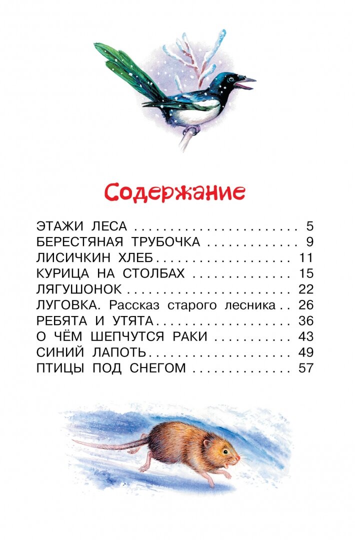 В сборник вошли десять лучших рассказов М. Пришвина о природе, которые входят в программы школьного и внеклассного чтения: «Лисичкин хлеб», «Луговка. Рассказ старого лесника», «Этажи леса», «Берестяная трубочка» и другие.