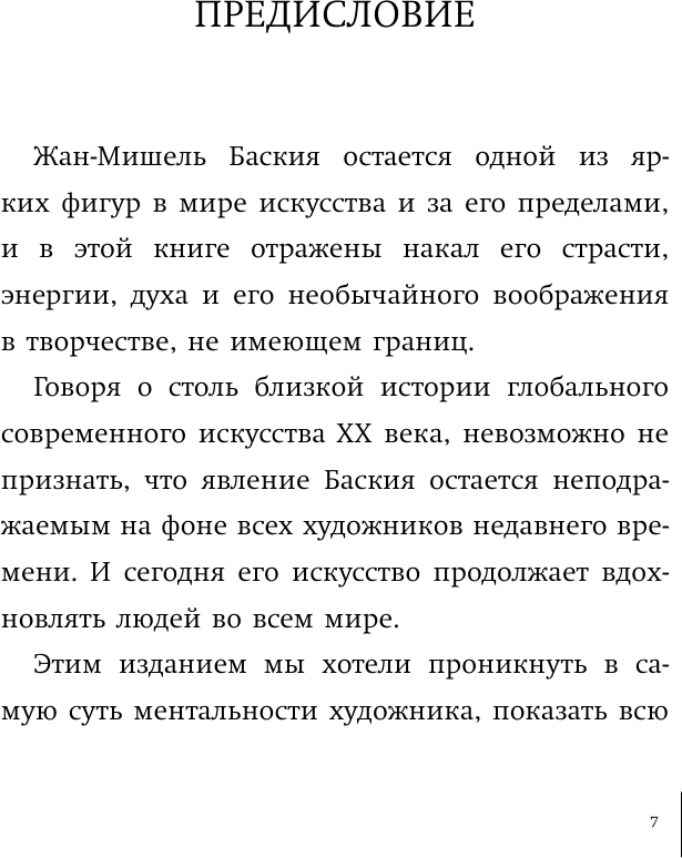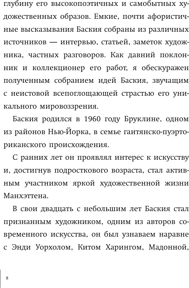 В своих картинах, записных книжках и интервью он показал себя сильным и творческим писателем и оратором, а также имиджмейкером. "Basquiat-измы" -это сборник важнейших цитат этого крестного отца стрит-арта. В этих кратких, убедительных и запоминающихся подборках, взятых из его интервью, а также из его дневников, Баския пишет и говорит о культуре, своей артистической персоне, мире искусства, художественном влиянии, расе, городской жизни и многих других темах. Лаконичные, прямые, сильные, поэтичные и загадочные слова Баскиа, как и его искусство, продолжают находить отклик.