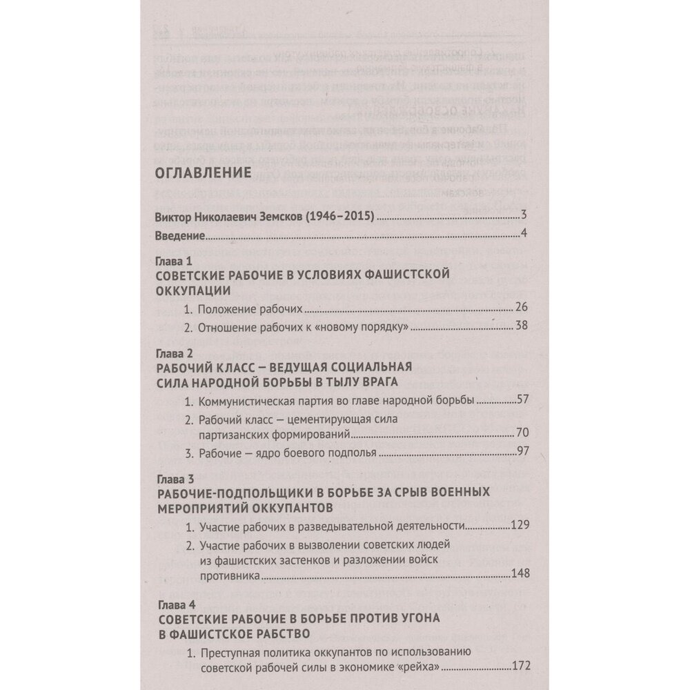 Труд Виктора Николаевича Земскова (1946–2015) посвящен изучению ключевой роли советского пролетариата в борьбе против немецко-фашистских оккупантов в годы Великой Отечественной войны. Исследование базируется на архивных источниках, сведениях периодической печати и историографии XX в.: статьях, брошюрах, отчетах местных партийных организаций и даже сведениях, почерпнутых из художественной литературы, например «Молодой гвардии» А. А. Фадеева. В данном контексте В. Н. Земсков впервые выделяет рабочий класс в отдельную категорию населения, оказавшую наиболее ожесточенное сопротивление в оккупации 1941–1944 гг.