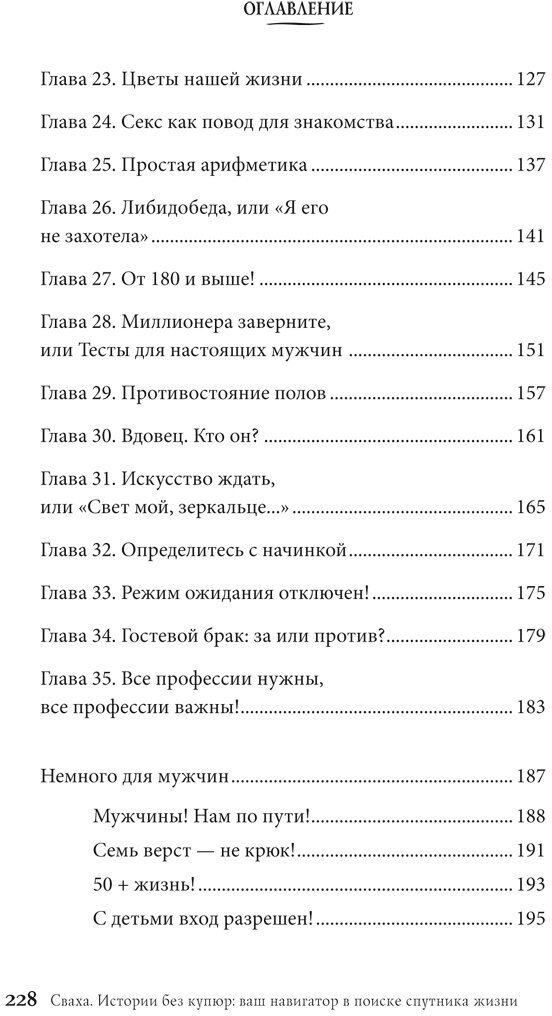 Профессия «сваха» существует несколько веков, и как бы неоднозначно к ней ни относились, она будет востребована вечно, ведь люди – существа парные и искать свою пару будут всегда. В этой книге я честно рассказываю о своей работе, трудностях поиска партнера через сваху, даю конструктивные рекомендации, которые могут помочь вам в самостоятельном поиске спутника жизни, и, конечно же, пишу немного о любви и семейных ценностях, потому что какие бы противоречия ни существовали между полами, мы, мужчины и женщины, не можем друг без друга!