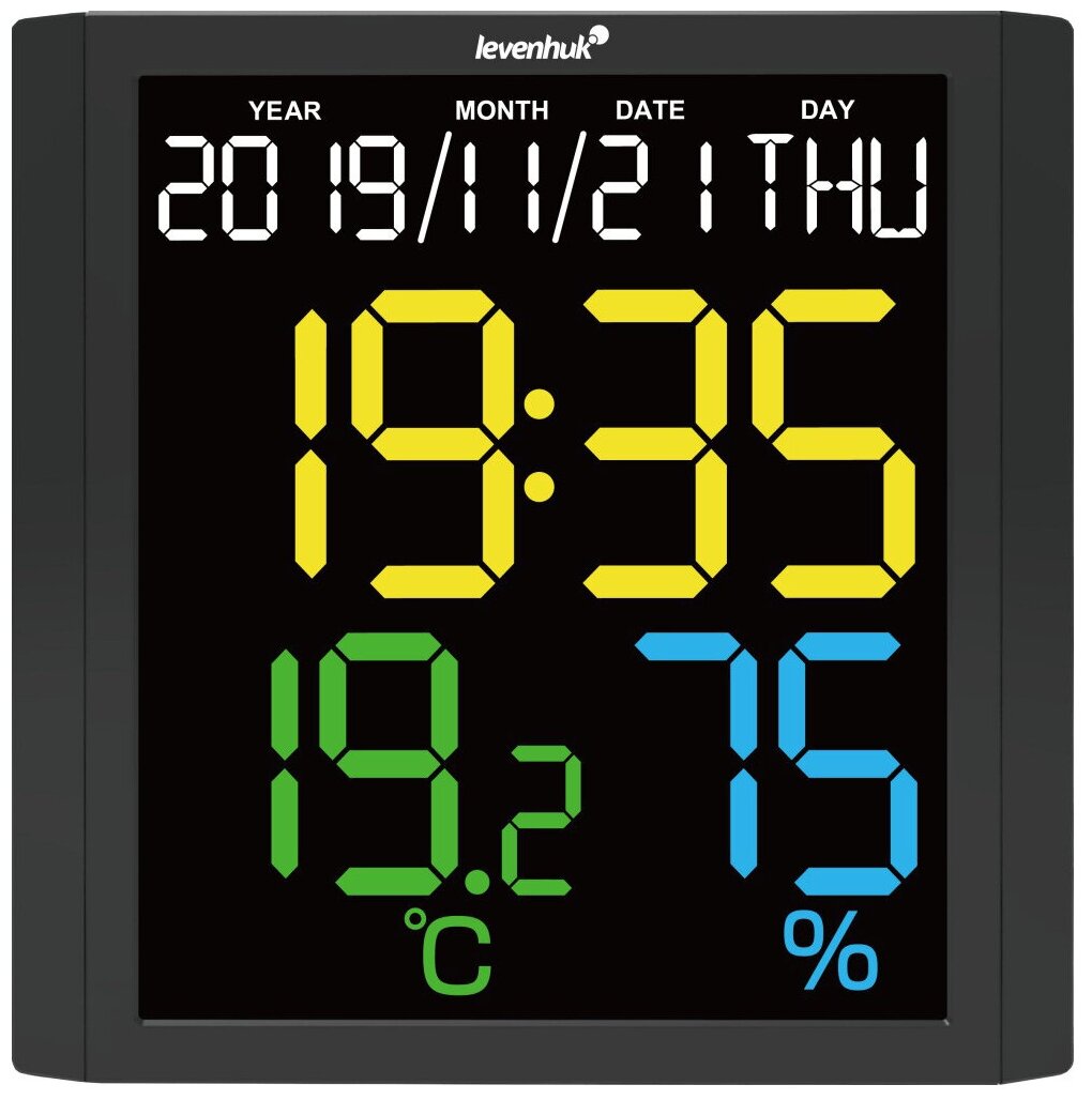 Levenhuk (Левенгук) - термогигрометр, позволяющий отслеживать показатели микроклимата. Дополнительное преимущество изделия - наличие часов (24/12 часовой формат отображения) и календаря. Устройство может работать как от сети через адаптер 5В 500 мА (нет в комплекте) и при помощи трех батареек.