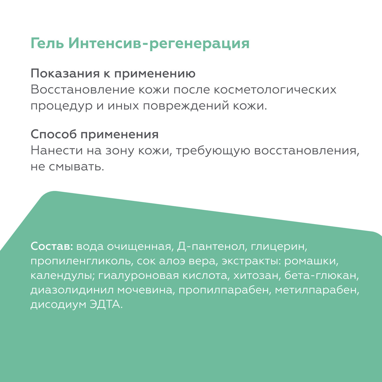 Гель сокращает реабилитационный период после любых повреждающих косметологических процедур, обладает выраженным ранозаживляющим эффектом, снимает раздражение, уменьшает папулы и другие следы проколов кожи, увлажняет и восстанавливает кожу.