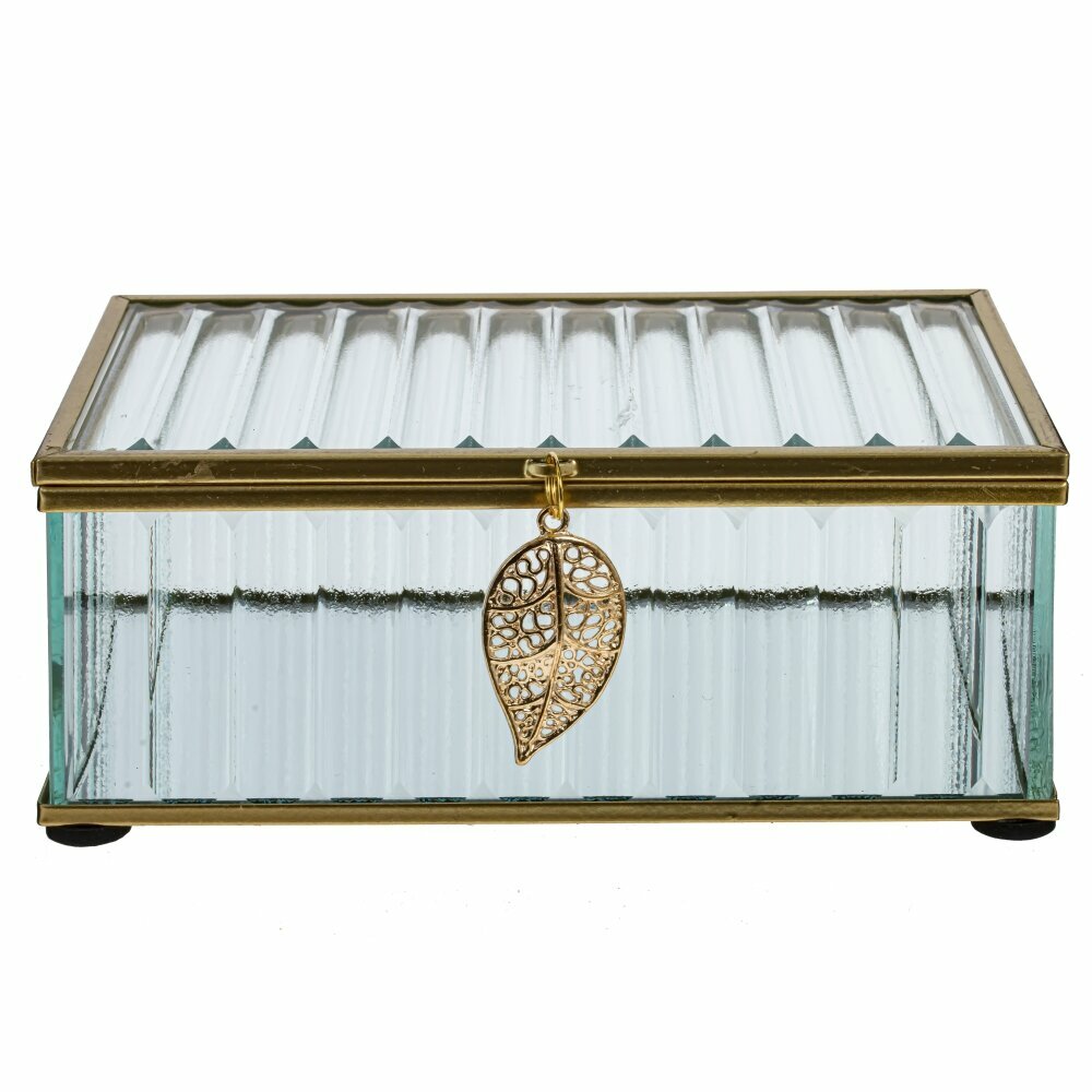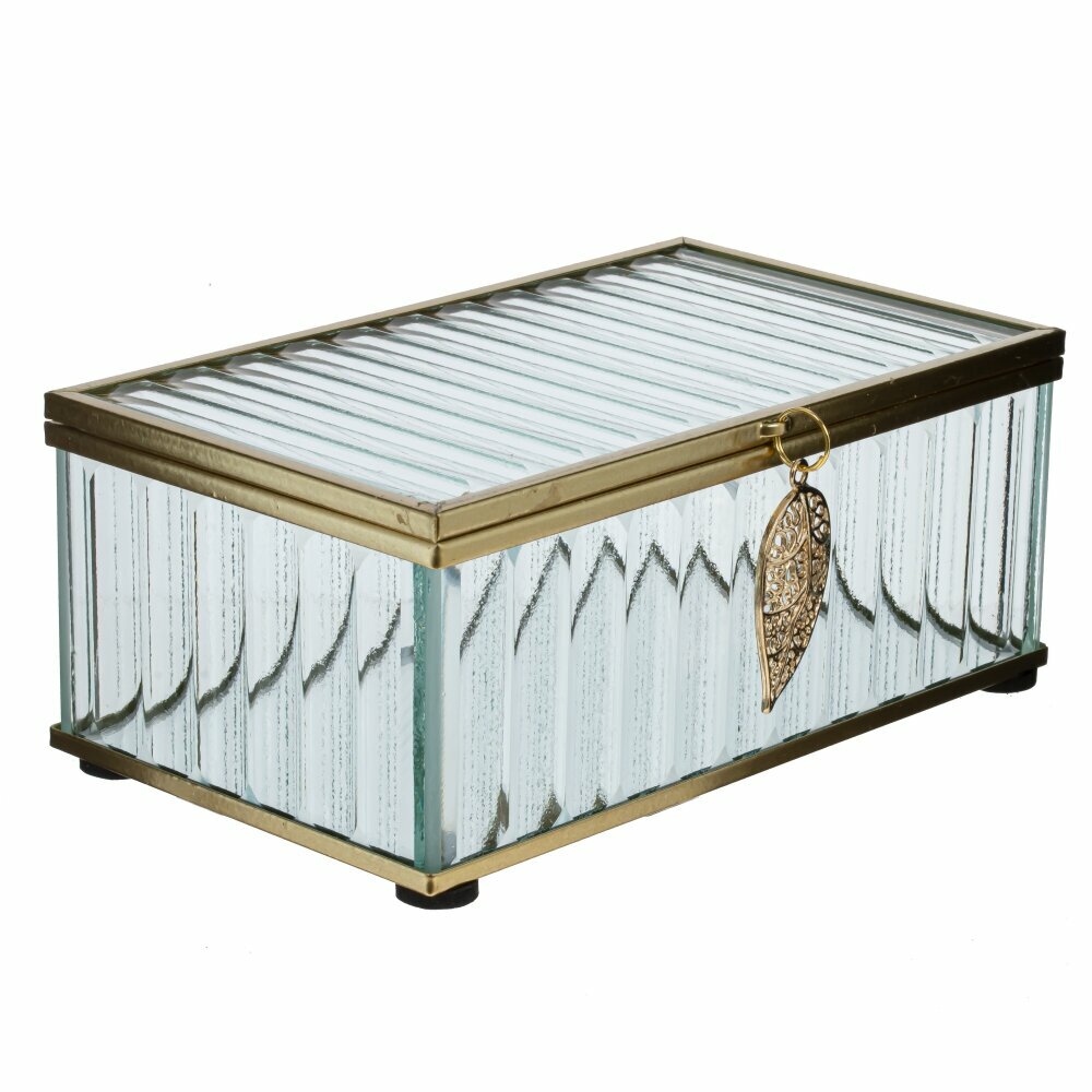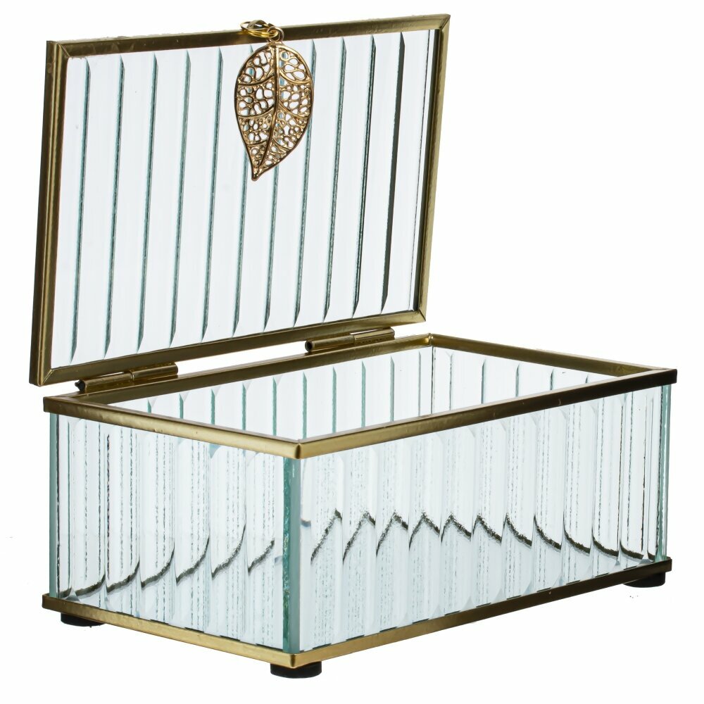 Шкатулка прямоугольной формы с откидной крышкой. Изделие изготовлено из прозрачного стекла, что позволяет наслаждаться красотой ее содержимого. Форма и сочетание стекла с металлом делают эту шкатулку не только функциональной, но и элегантной.