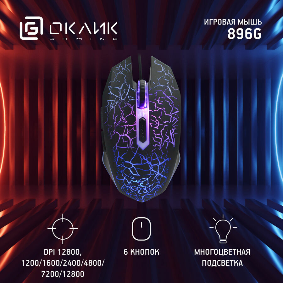 Мышь Оклик 896G черный оптическая (12800dpi) USB для ноутбука (5but)