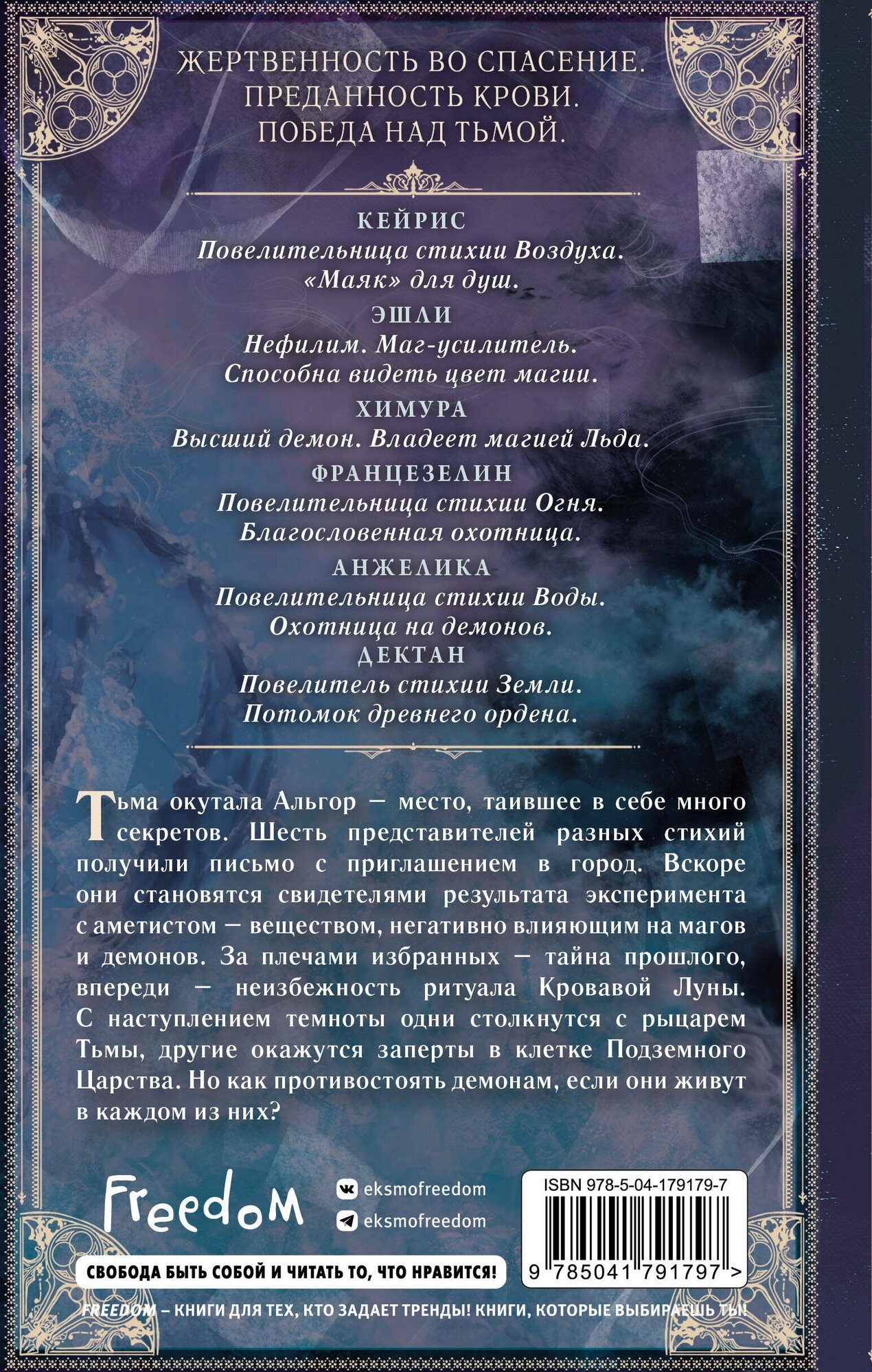 Шесть представителей разных стихий получили письмо с приглашением в город. Вскоре они становятся свидетелями результата эксперимента с аметистом – веществом, негативно влияющим на магов и демонов. За плечами избранных – тайна прошлого, впереди – неизбежность ритуала Кровавой Луны. С наступлением темноты одни столкнутся с рыцарем Тьмы, другие окажутся заперты в клетке Подземного Царства. Но как противостоять демонам, если они живут в каждом из них?