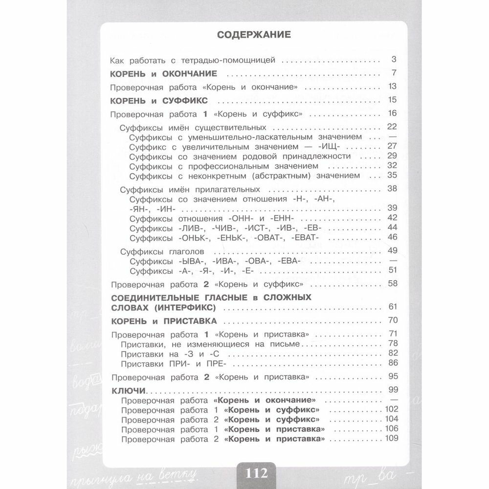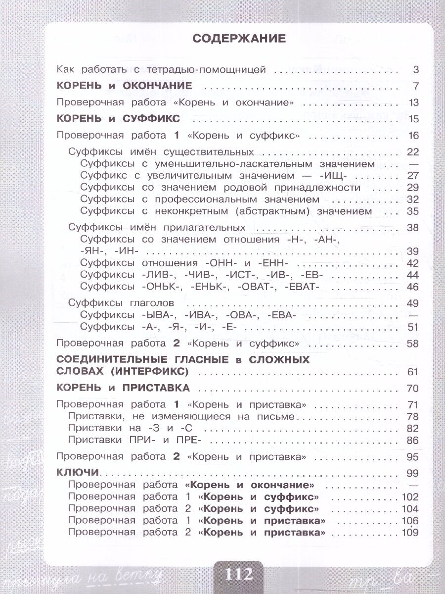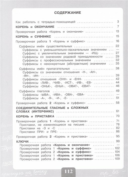 В тетради предусмотрено выполнение пяти проверочных работ: одна работа проводится в конце темы «Корень и окончание», по одной работе до начала и после прохождения тем «Корень и суффикс» и «Корень и приставка».
