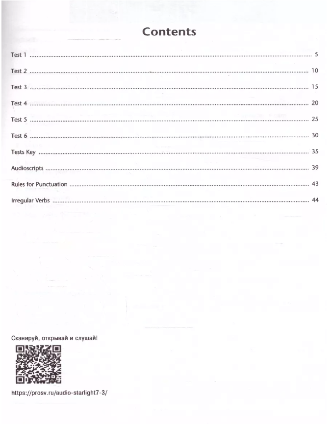 Сборник контрольных заданий является обязательным компонентом УМК серии "Звёздный английский" для учащихся 7 класса общеобразовательных организаций и школ с углублённым изучением английского языка. Он включает контрольные работы, которые выполняются учащимися по завершении работы над каждым модулем учебника в качестве итогового контроля. Сборник также содержит ключи к контрольным работам и аудиоскрипты.