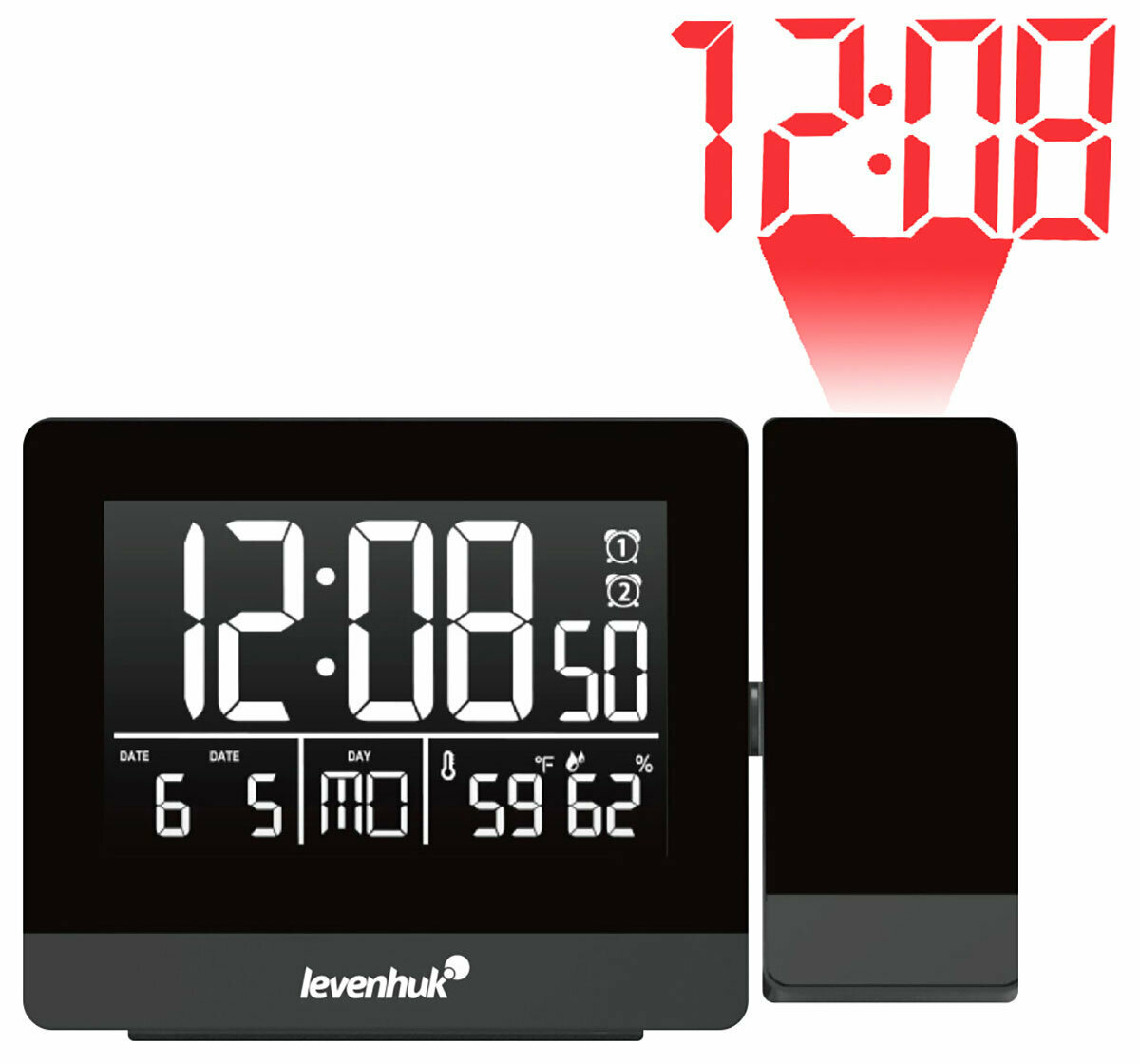 Levenhuk – это часы-термометр с проектором и встроенным гигрометром. Стильный многофункциональный гаджет украсит собой любой интерьер, покажет точное время и поможет всегда быть в курсе основных параметров микроклимата – температуры и влажности. Кроме того, прибор оснащен будильником с возможностью установки двух сигналов. Справа от экрана расположен небольшой поворотный блок, который проецирует значение времени на стену, потолок или другую ровную поверхность.