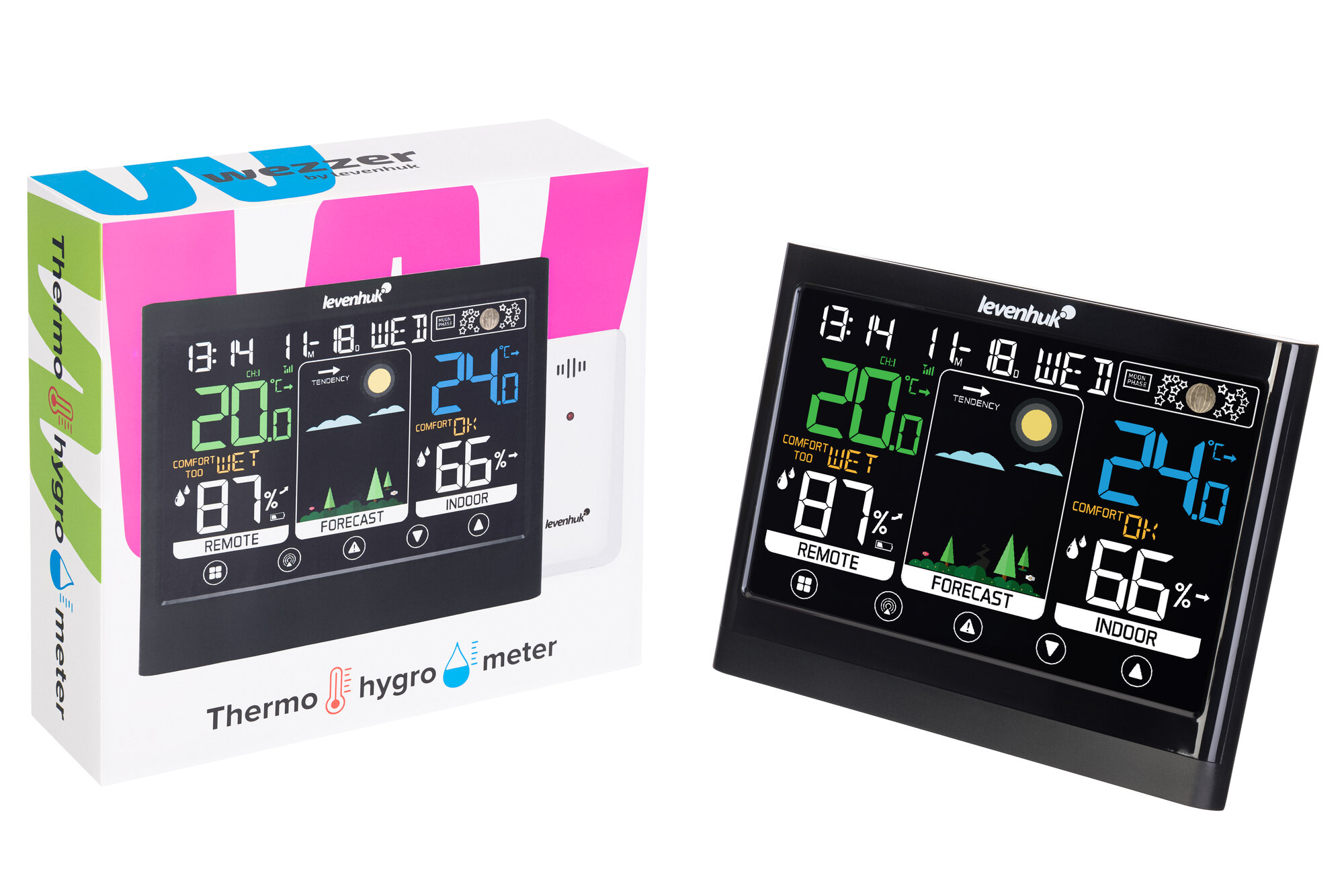 Цифровая метеостанция Levenhuk (Левенгук) с выносным датчиком контроля и прогноза погоды. Позволяет определить потенциальное изменение погодных условий в ближайшее время, что упрощает процесс подбора одежды. Удобные часы с будильником привносят универсальности данному устройству.