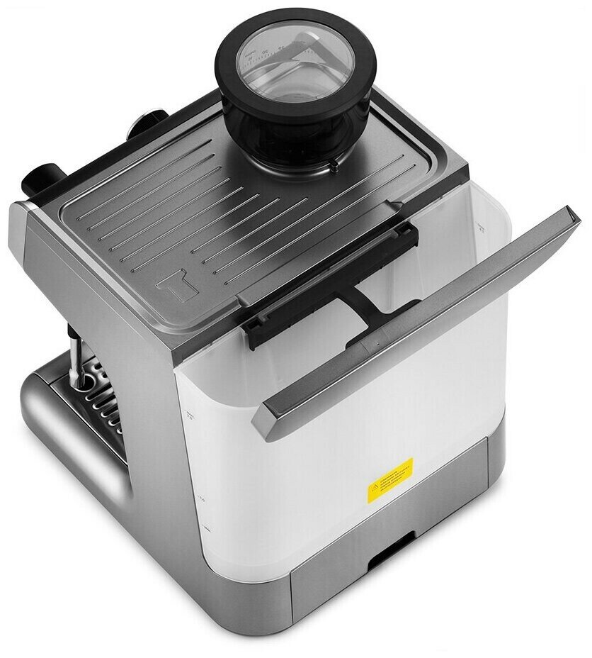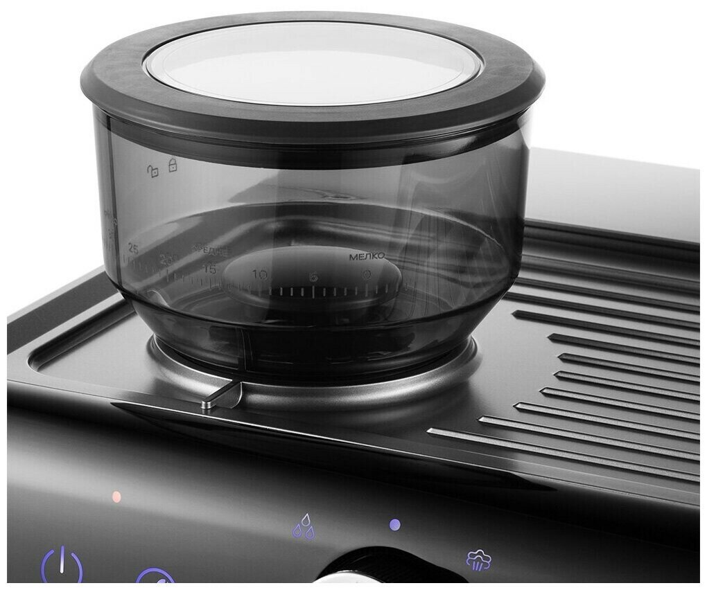 Кофеварка приготовит для вас любимый эспрессо, капучино, латте, а также множество других видов кофе. Встроенная кофемолка измельчит кофейные зёрна до нужного вам помола. Также с помощью кофейной станции вы можете подогреть паром остывший чай или молоко. Встроенная кофемолка с коническими металлическими жерновами позволяет качественно измельчать кофейные зёрна непосредственно перед приготовлением, что положительно отражается на вкусе готового напитка. Чаша ёмкостью 250 г имеет съёмную крышку. Молотый кофе помещается в фильтр рожка, прессуется в таблетку темпером, затем вода проливается сквозь кофе под давлением. Напиток получается без примеси гущи, сохраняется оригинальный вкус зёрен, большое количество полезных веществ и тонкий аромат кофе. Капучинатор в кофеварке – это паровая трубка с насадкой панарелло. Трубку погружают в холодное молоко, включают подачу пара и взбивают пенку. Также можно подогреть остывший чай или молоко. Металлический питчер с удобной ручкой и носиком идёт в комплекте. С помощью стильной панели управления вы можете выбрать одинарный или двойной эспрессо, включить подачу пара на стимере, настроить температуру заваривания кофе, запустить помол зёрен. Помимо основных функций, вы можете запрограммировать время пролива воды, подаваемое через рожок путём нажатия и удержания кнопки «Эспрессо» или «Двойной эспрессо» необходимое количество времени. Кофеварка запомнит это время при следующем приготовлении. На платформу можно ставить чашки и темпер, чтобы они были тёплыми или лучше сохли после мытья. На платформе удобно размещать чашки во время приготовления молочной пены. К моменту, когда вы закончите, чашки успеют подогреться. Резервуар для воды объёмом 2.8 л легко снимается и наполняется водой. Его легко чистить за счёт удобной формы и широко открывающейся крышки. Поддон для сбора капель со съёмной решёткой из нержавеющей стали легко снимается, моется и устанавливается обратно. Металлические фильтры с лазерным нанесением отверстий долговечны и не требуют использования каких-либо расходующихся частей. Темпер качественно утрамбовывает кофе в фильтре, а в питчере удобно взбивать молоко и художественно оформлять напитки.