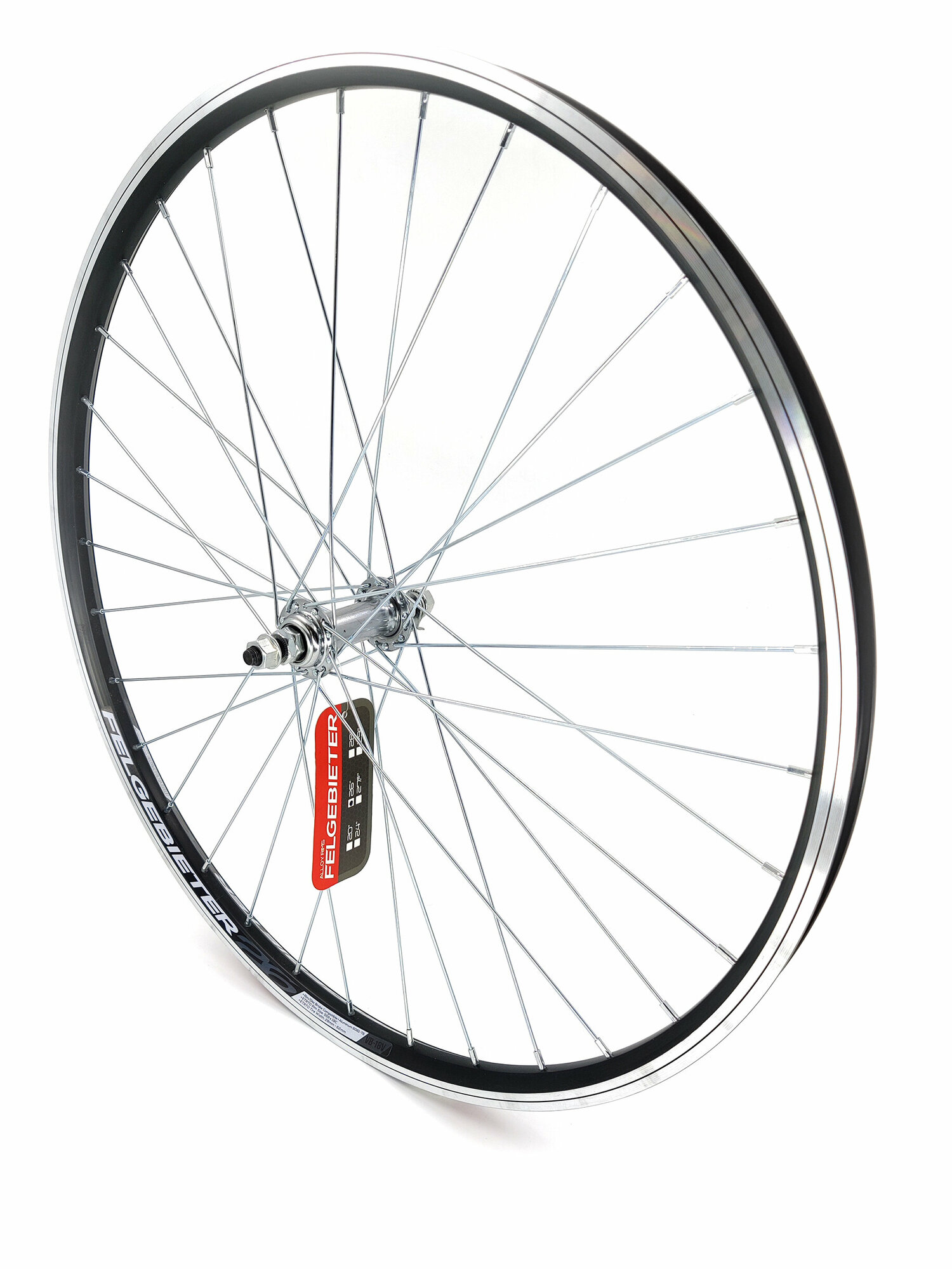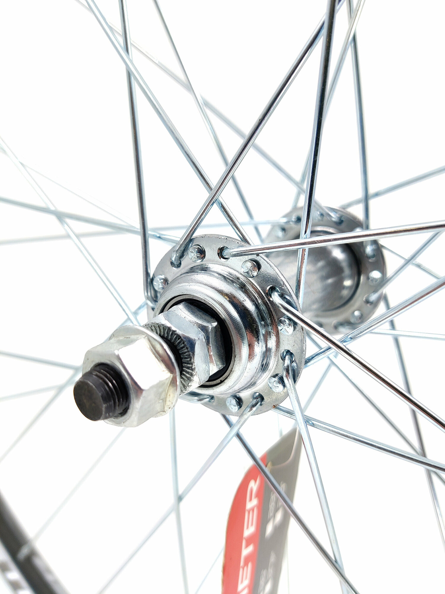Переднее колесо на промышленных подшипниках обеспечивает хороший накат вашему велосипеду. Оно подходит для использования с ободными тормозами. Двойной обод делает колесо более прочным, благодаря чему оно лучше сопротивляется появлению биений. Ширина втулки составляет 100 мм, сделана она из стали с осью под эксцентрик, что позволяет легко и быстро снимать и устанавливать колесо, например, для перевозки велосипеда. В комплекте идёт ободная лента.