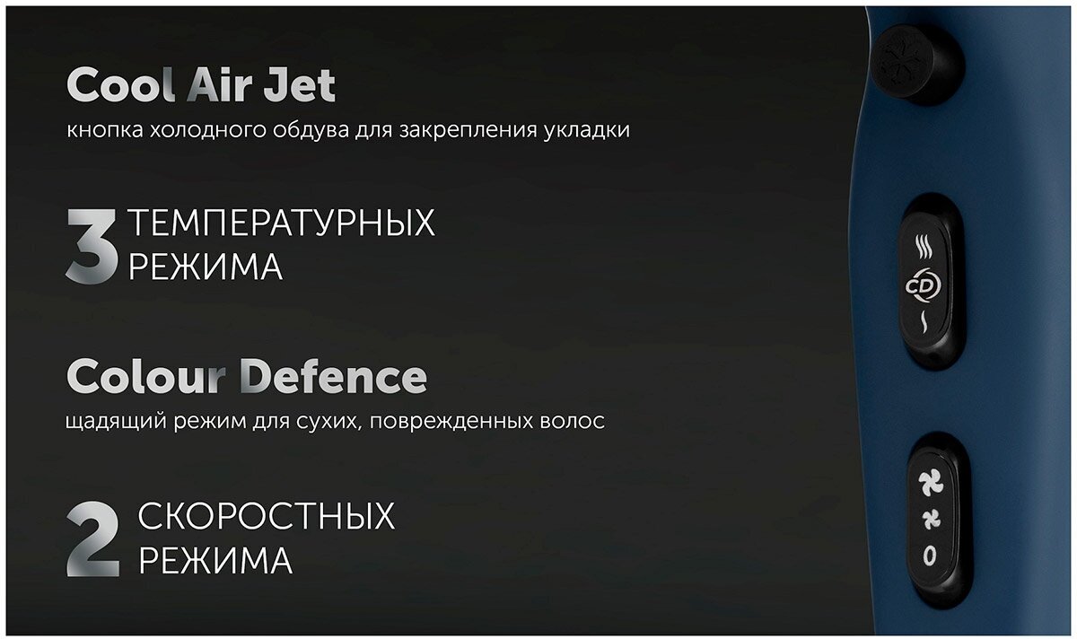 Режим Colour Defence - щадящий режим сушки бережно сушит сухие, поврежденные волосы; сохраняет насыщенный цвет и сияние