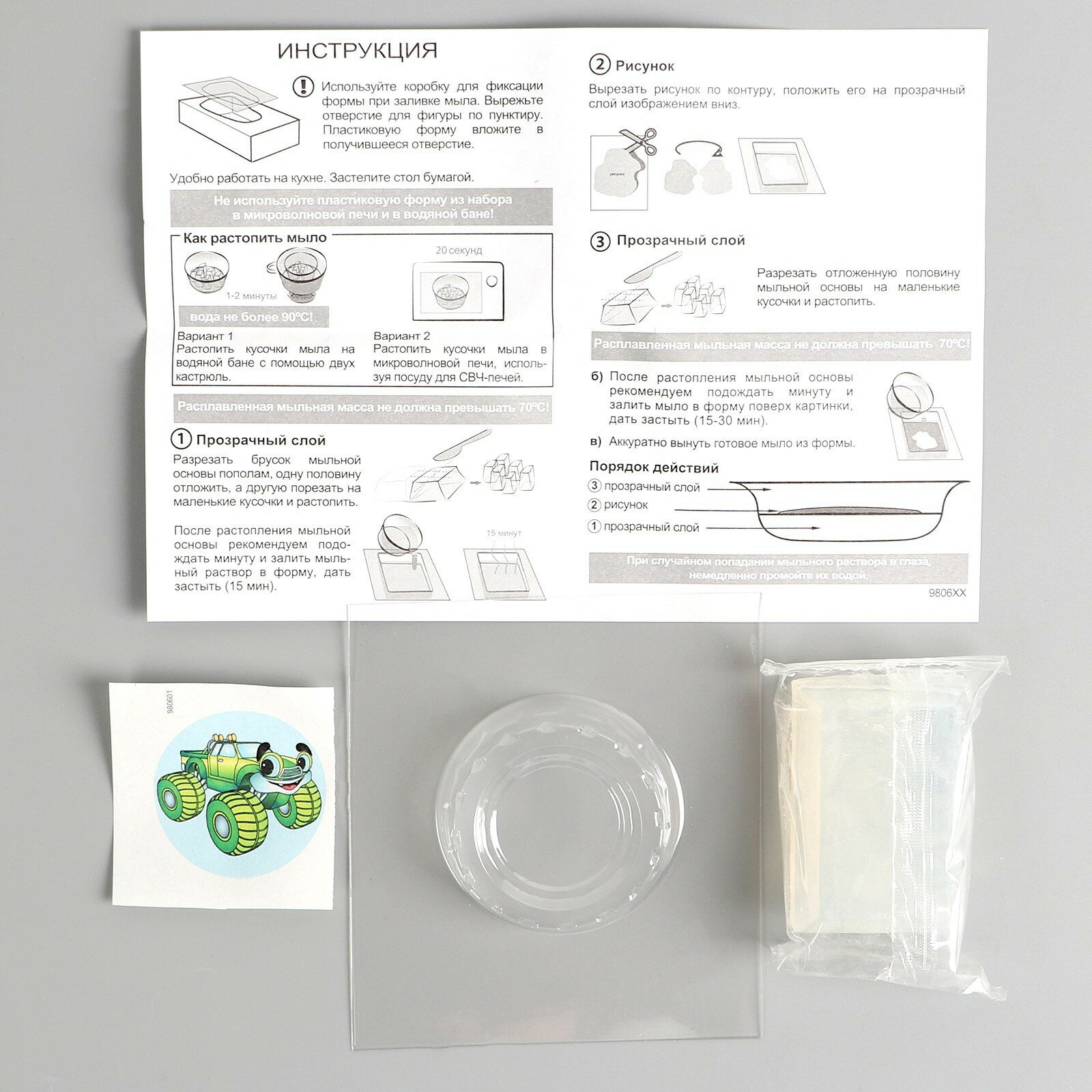 В набор входит: мыльная основа, формочка для отливки мыла, картинка на водорастворимой бумаге, инструкция.