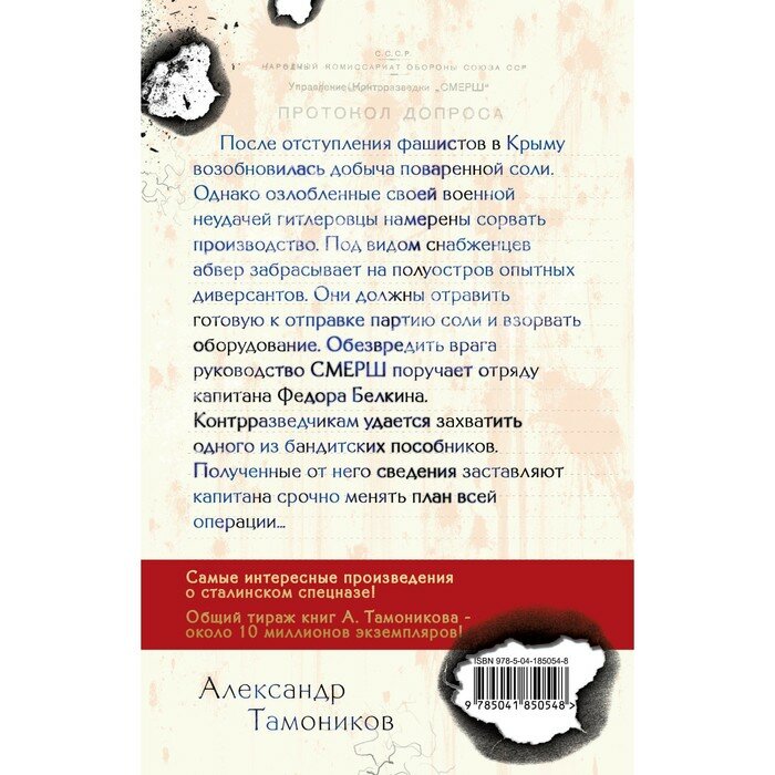 После отступления фашистов в Крыму возобновилась добыча поваренной соли. Однако озлобленные своей военной неудачей гитлеровцы намерены сорвать производство. Под видом снабженцев абвер забрасывает на полуостров опытных диверсантов. Они должны отравить готовую к отправке партию соли и взорвать оборудование. Обезвредить врага руководство СМЕРШа поручает отряду капитана Федора Белкина. Контрразведчикам удается захватить одного из бандитских пособников. Полученные от него сведения заставляют капитана срочно менять план всей операции…