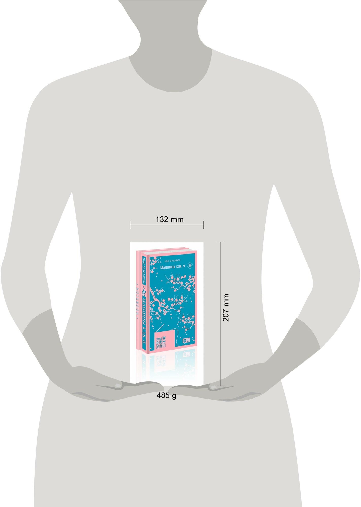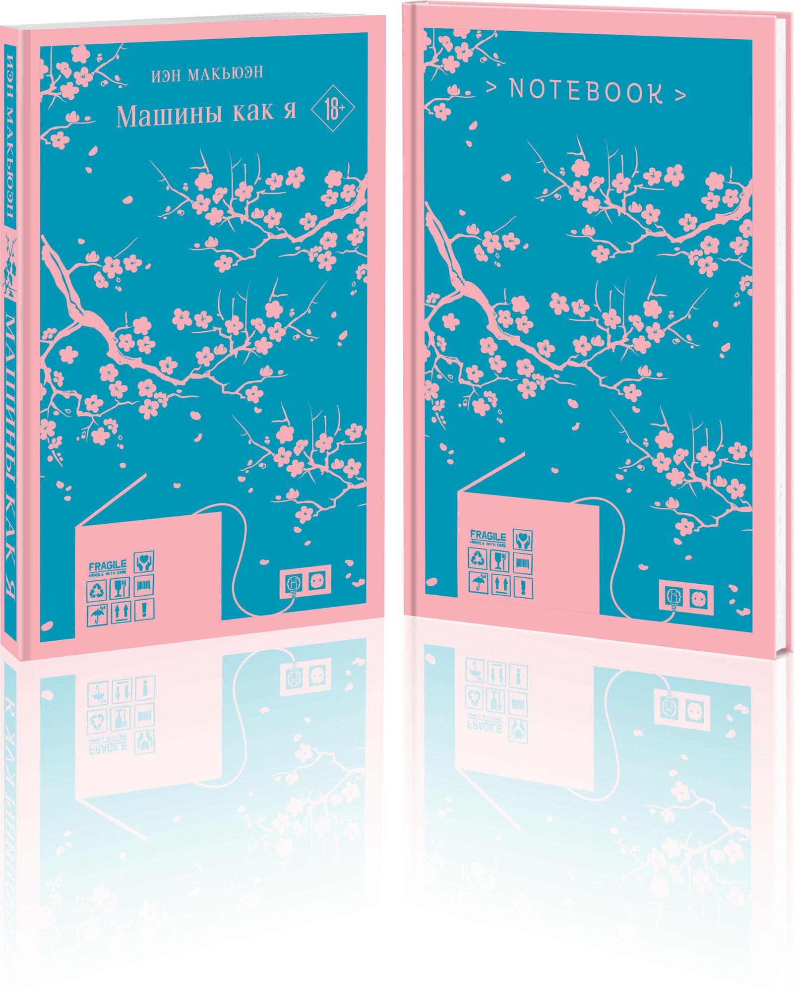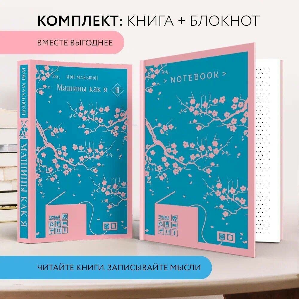 В комплект входит антиутопия Иэна Макьюэна «Машины как я» и тематический блокнот, повторяющий обложку книгу.