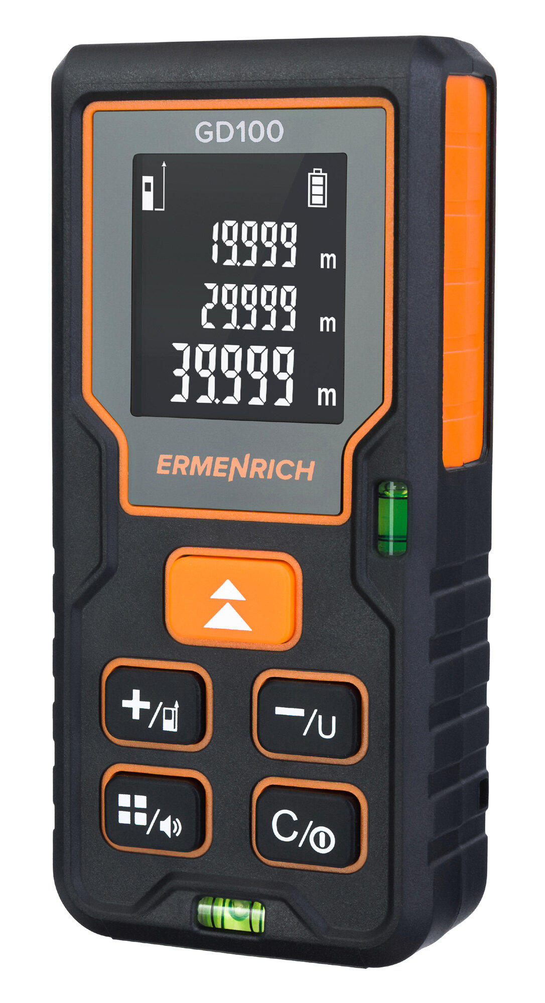 Ermenrich – лазерная рулетка, разработанная для решения широкого спектра задач в проектировании, строительстве, ремонтных работах, кадастровом и маркшейдерском деле, промышленном производстве. Рулетка подходит для измерения длины любых частей строений и деталей, а также площадей и объемов помещений. При невозможности поместить устройство в начальную точку измеряемой линии встроенная функция «Пифагор» позволяет провести замер на основе косвенных измерений.