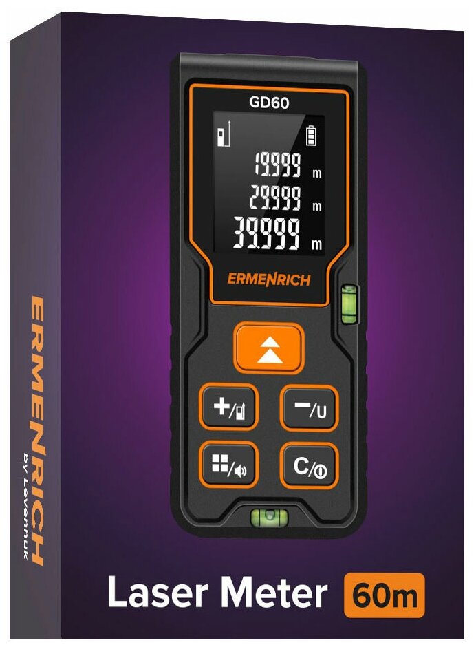 Ermenrich – лазерная рулетка, рассчитанная на широкий спектр работ в строительстве, ремонте, на производстве и в кадастровом деле. Рулетку можно использовать для выяснения точных линейных размеров помещений и деталей, а также их площадей и объемов. Память устройства одновременно сохраняет до 20 групп данных. Для отображения результатов измерений и расчетов прибор снабжен ЖК-экраном с 3 отображаемыми строками. Также рулетка поддерживает функцию расчета параметров на основе данных промежуточных замеров, известную как функция «Пифагор».