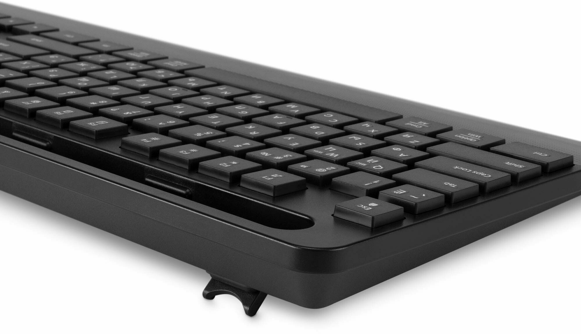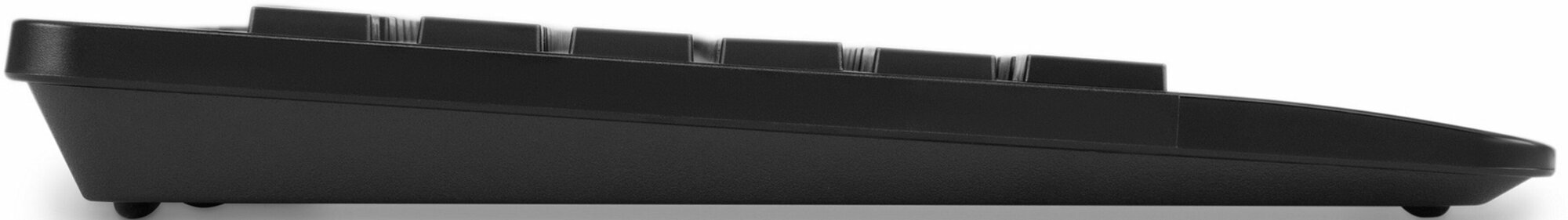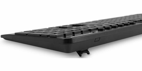Еще более комфортной работу с этой моделью делают подставка для запястий, прорезиненные регулируемые по высоте ножки и наличие влагозащитного корпуса.