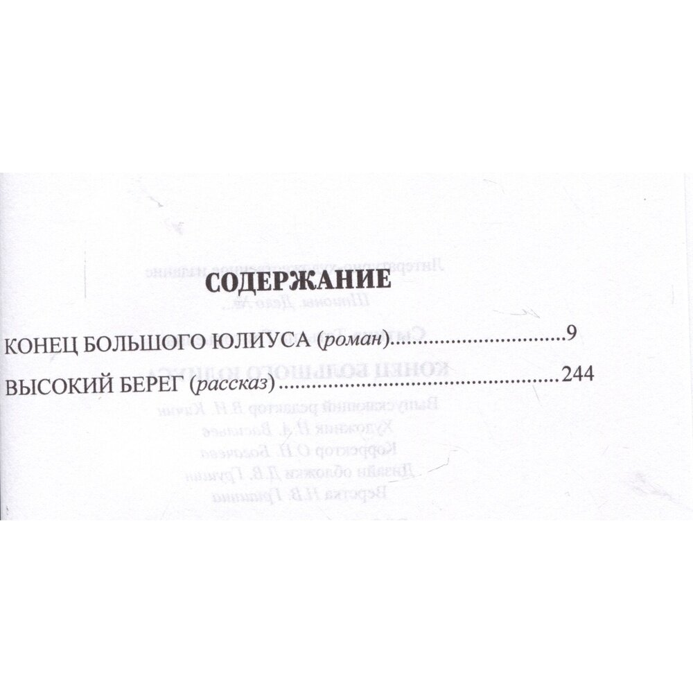 В представленный выпуск включены два остросюжетных произведения известной писательницы и сценариста Татьяны Сытиной (1915—1966). «Конец Большого Юлиуса» (1956) — это классический образец шпионского романа о схватке советских разведчиков с неуловимым Большим Юлиусом. Как бы враг ни петлял и ни хитрил, его игра будет проиграна. Бестселлер 1950-х возвращается к читателю. Рассказ «Высокий берег» (1945) — о неожиданной встрече лейтенанта Луконина в Германии сразу после окончания войны.