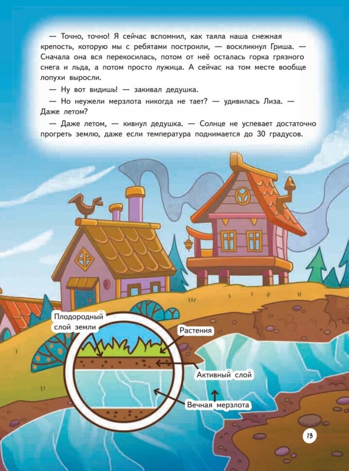 Книга красивая, полезная и информативная. По сути – это энциклопедия, которая подаётся в виде истории. История простенькая, на первый взгляд, но в ней «спрятано» огромное количество самых разнообразных фактов. Почти на каждом развороте цветные иллюстрации, которые помогают лучше усвоить материал. Они своеобразные, но милые и забавные, нам понравились. И считаю удачным само решение: объяснять не только на словах, но и при помощи картинок. Например, показано устройство собачьей упряжки, показан слой вечной мерзлоты «в разрезе». Доходчиво и увлекательно, хотя поначалу показалось немного занудно. Надо втянуться. Бумага приличная, шрифт чёткий, буквы пухленькие, хорошо видны, и буква «Ё» с точками, как положено.