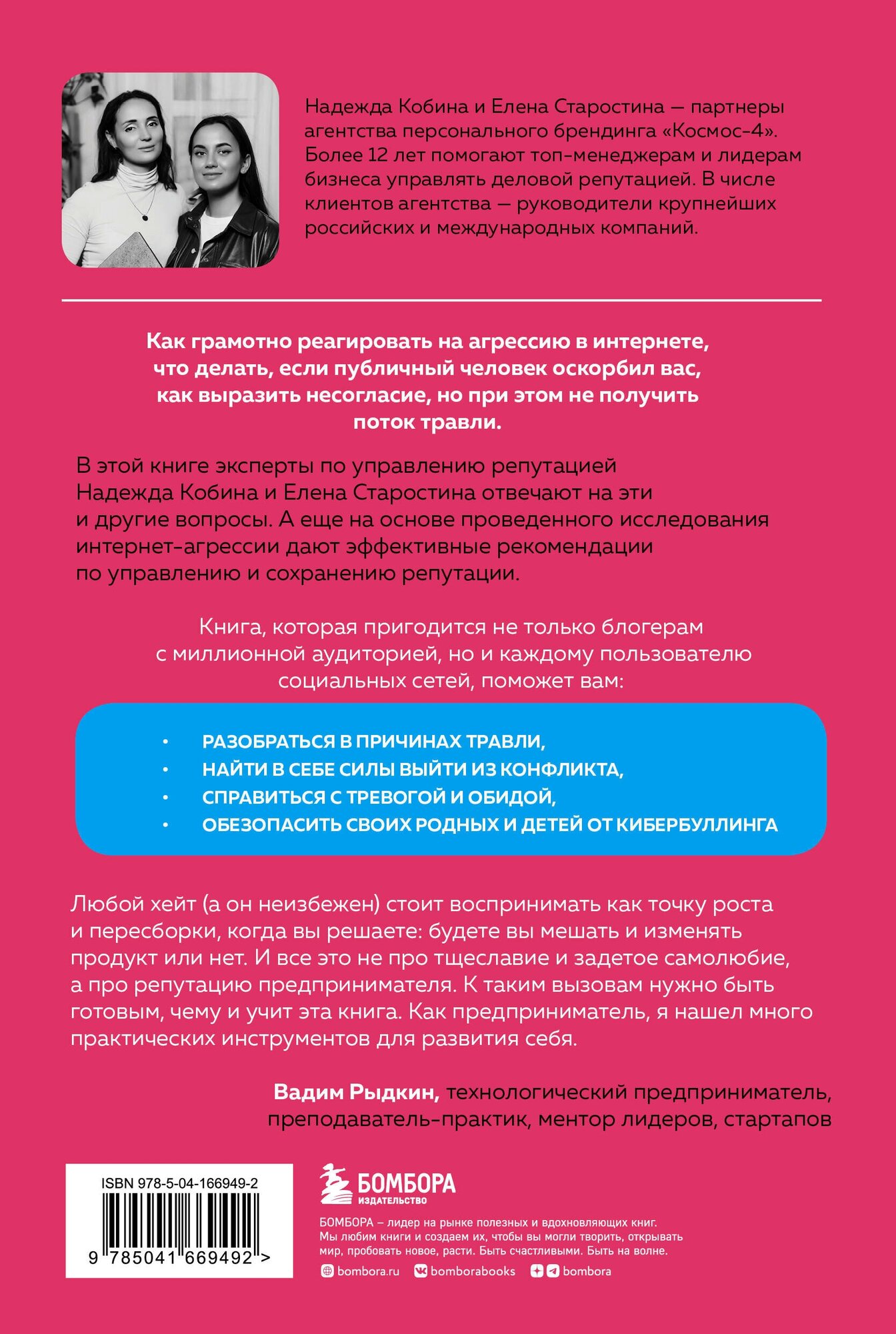 В этой книге эксперты по управлению репутацией Надежда Кобина и Елена Старостина отвечают на эти и другие вопросы. А еще, на основе проведенного исследования интернет-агрессии, дают эффективные рекомендации по управлению и сохранению репутации.