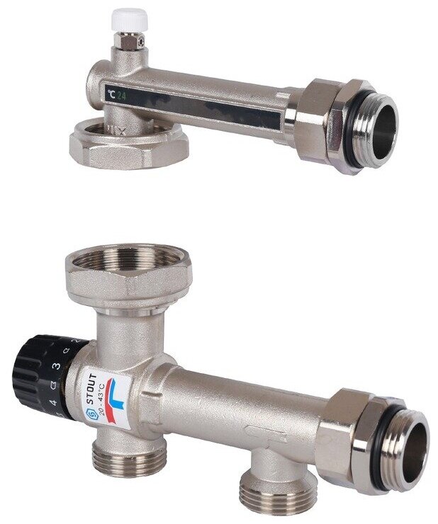 Насосно-смесительный узел с с 4-х ходовым термостатическим клапаном STOUT (Стаут) применяется для эффективной работы системы теплого пола. Устройство способно поддерживать температуру в диапазоне от +30 до +60 градусов. Материалом изготовления деталей узла служит латунь.