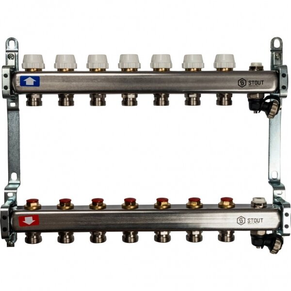 Коллектор с запорными клапанами Stout (Стаут) является важной деталью системы, в которой необходимо создать до 7 отопительных контуров. Модель рассчитана на давление до 10 бар и оснащена автоматической системой удаления воздуха, что гарантирует непрерывную и безопасную эксплуатацию.