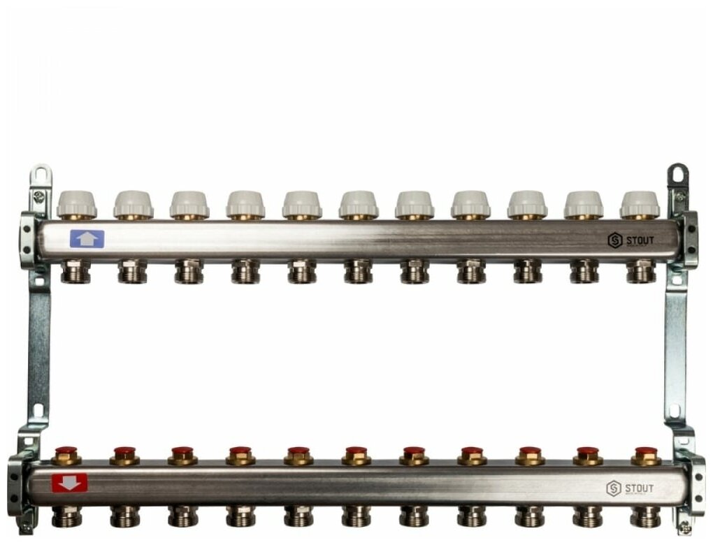 Коллектор с запорными клапанами Stout (Стаут) обеспечивает разделение главной магистрали на 11 отдельных отопительных контуров. Прибор отличается быстрой и простой установкой, корпус коллектора изготавливается из качественной нержавеющей стали, которая не окисляется при работе с агрессивной водной средой.