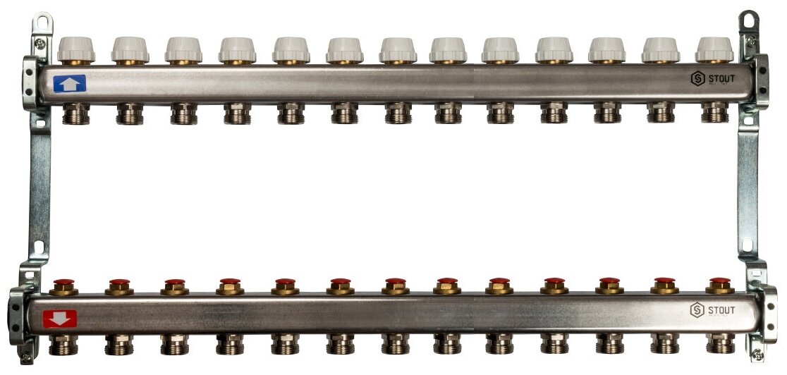 Коллектор с запорными клапанами Stout (Стаут) способен разделить центральную отопительную магистраль на 13 раздельных контуров, чтобы обеспечить подачу теплоносителя, например, в многоквартирном жилом доме. Оборудование отличается повышенной надежностью и выполнено из материалов особой прочности.