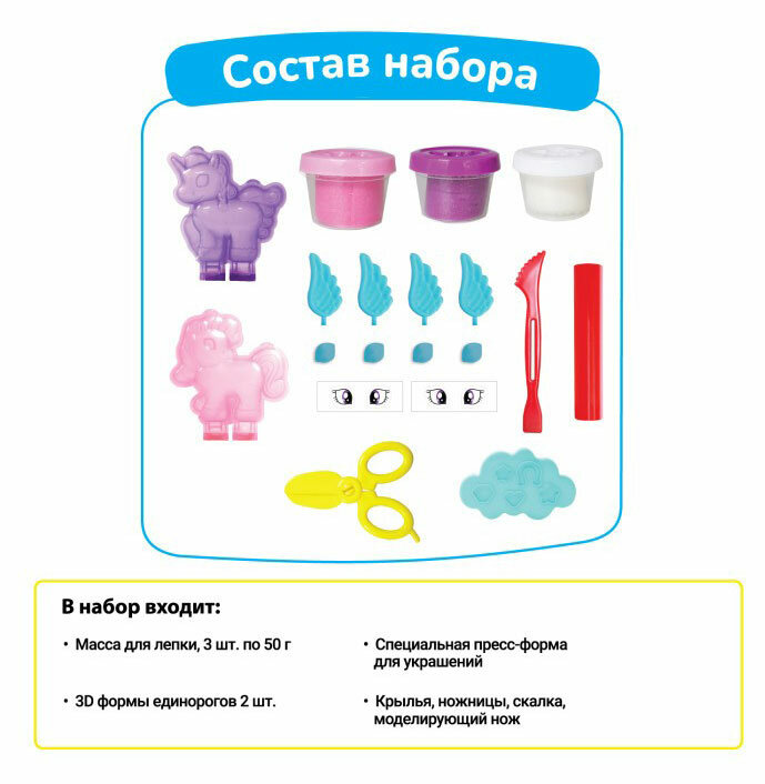 3D формочки, входящие в комплект, помогут вашему ребенку легко создать объемные фигуры сказочных единорогов, а украсить волшебных питомцев можно при помощи специальной пресс-формы для украшений.