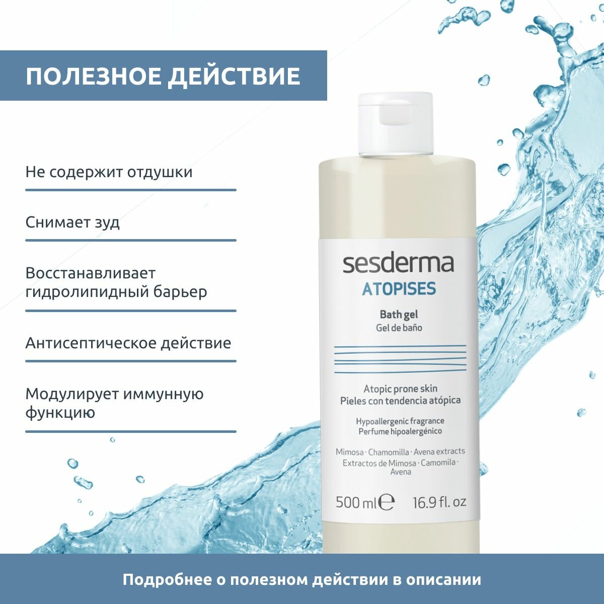 Гель для душа Atopises на основе транексамовой кислоты, цетилпиридиния, экстрактов овса, ромашки и мимозы снимает и предотвращает зуд, успокаивает, увлажняет и восстанавливает гидролипидный барьер кожи, усиливает местный иммунитет, оказывает антисептическое действие, благодаря чему снижается интенсивность и частота обострений. Вспомогательное средство в терапии с применением кортикоидов и иммуномодуляторов. Предотвращает, локализует и уменьшает количество очагов инфекции, предотвращает развитие суперинфекции благодаря бактерицидному действию цетилпиридиния.