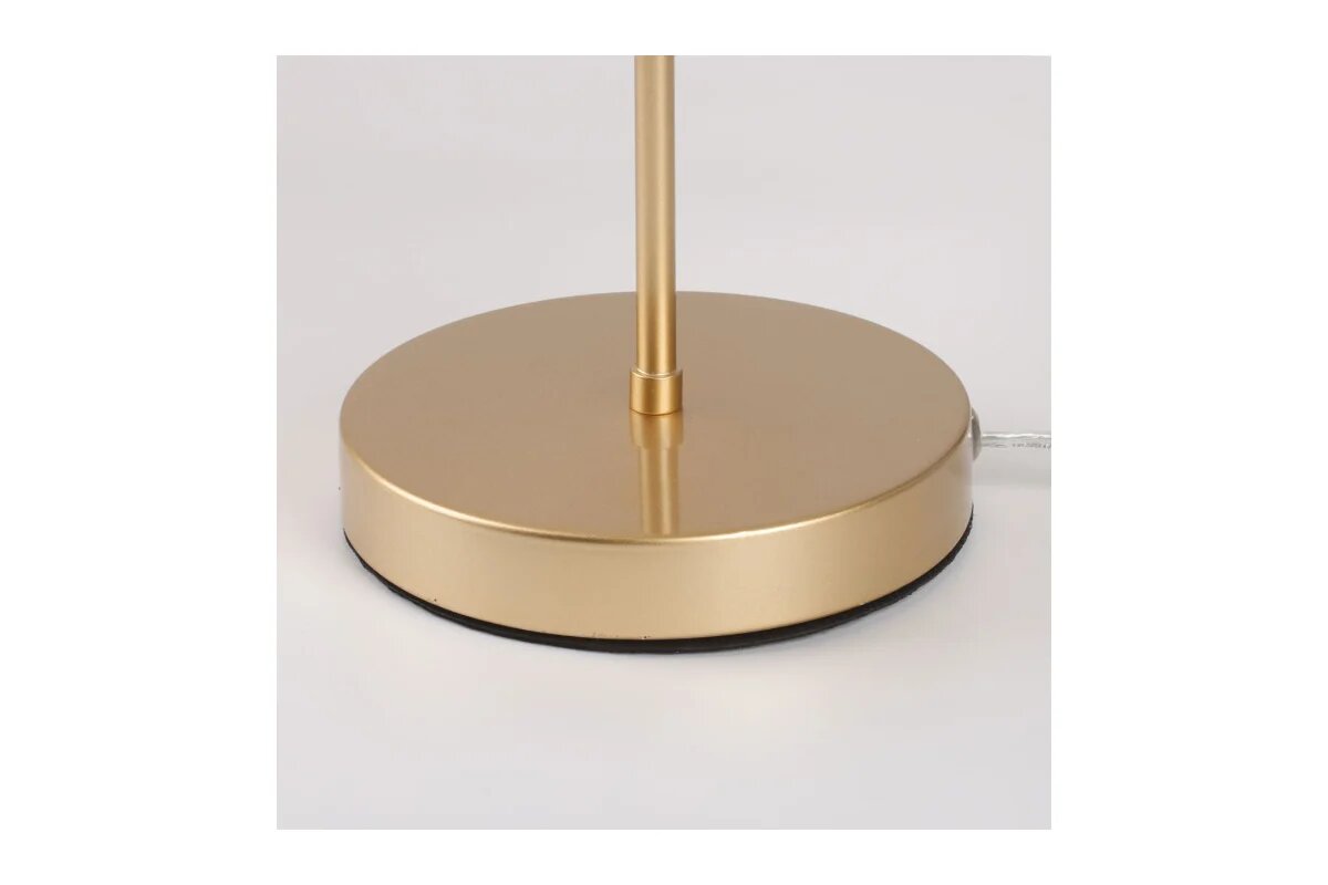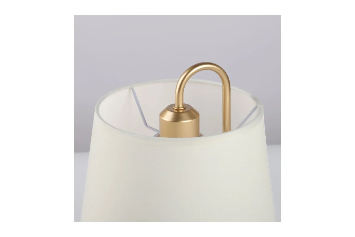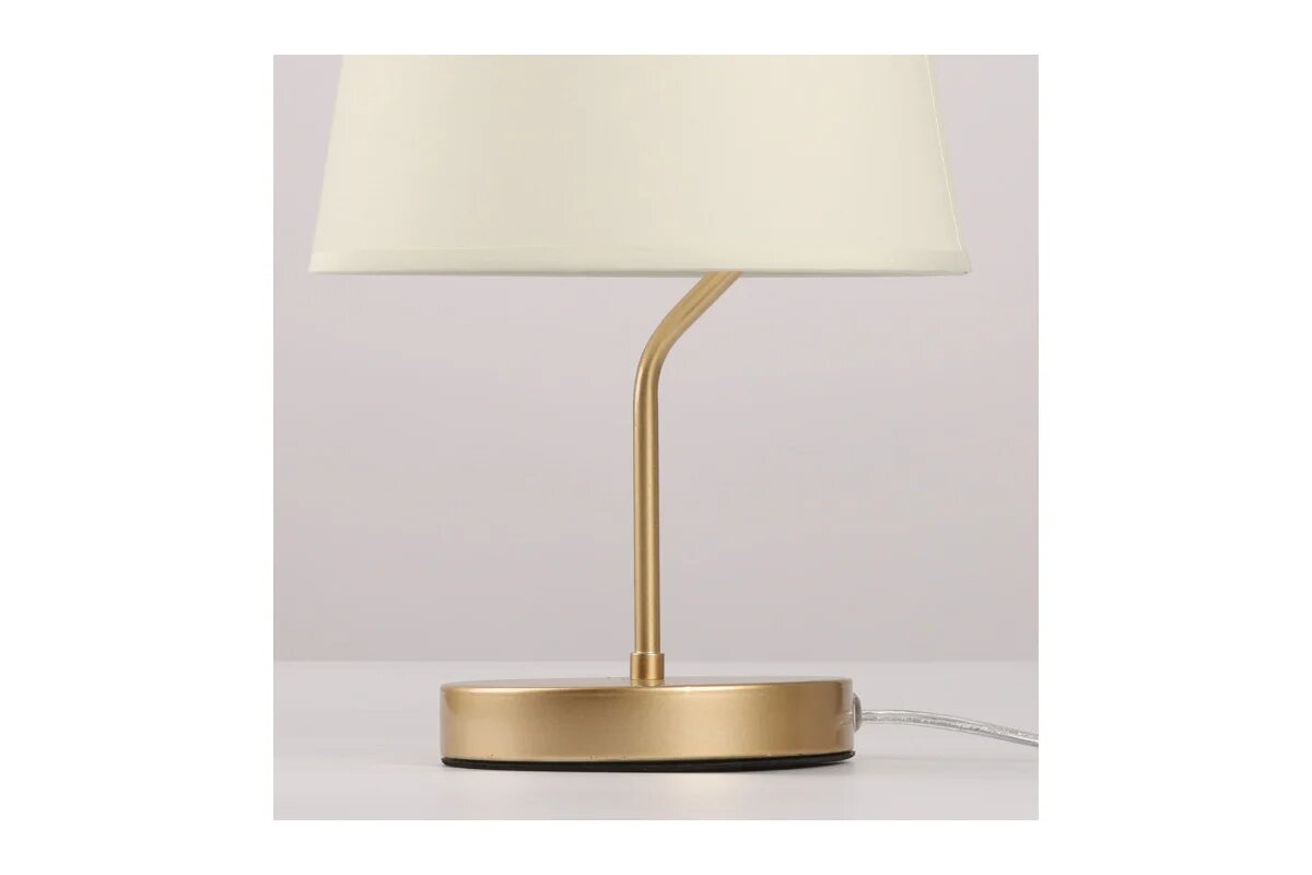 Металлическое основание настольной лампы окрашено в цвет перламутрового золота. Заменяемый источник света закрыт текстильным абажуром бежевого цвета. С внутренней стороны текстиль защищен прозрачным термостойким акрилом. Абажур отделан кантами и прошит.