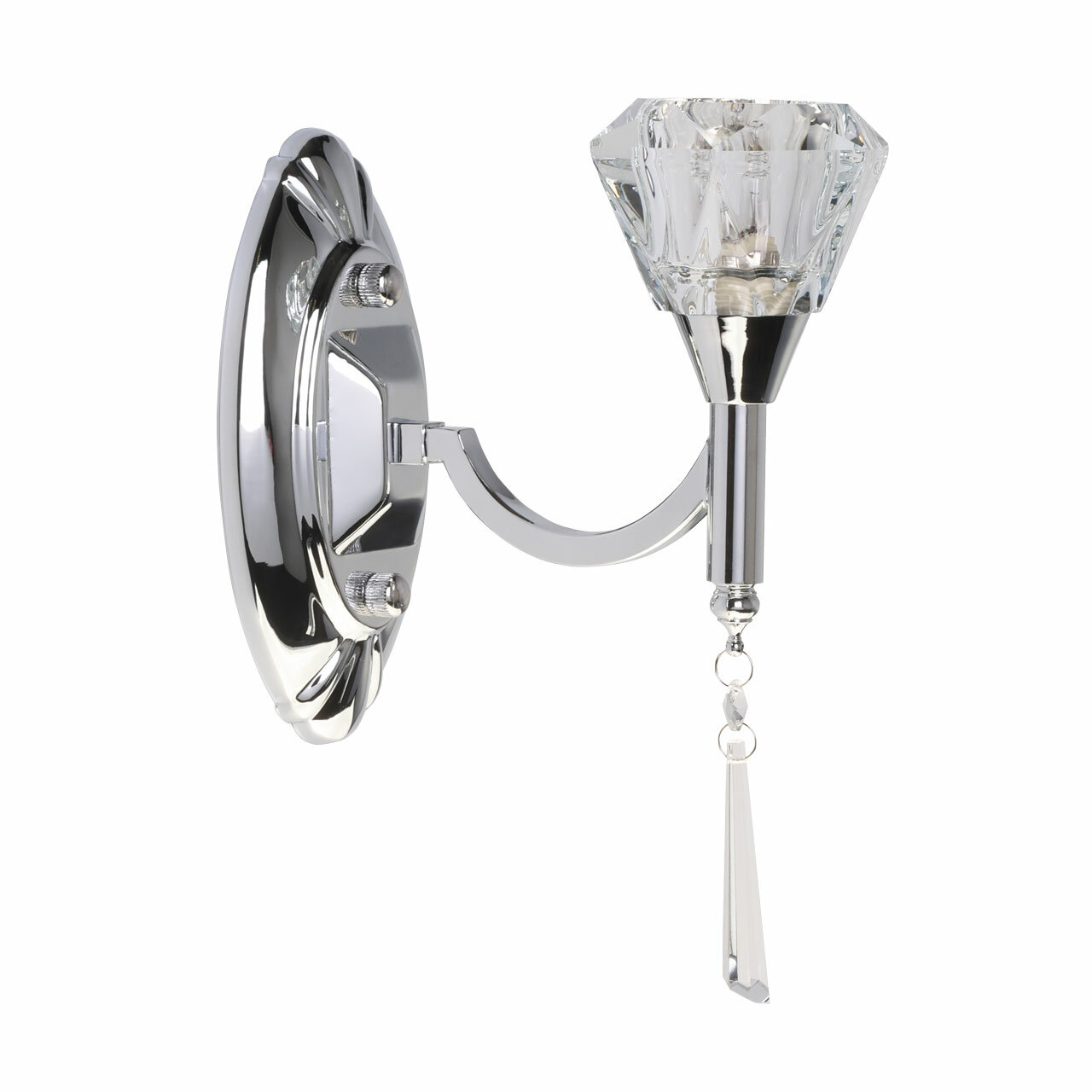 Металлическое основание настенного бра гальванизировано в цвет хрома. Плафон выполнен из прозрачного массива хрусталя. Светильник декорирован хрустальной подвеской вытянутой формы.