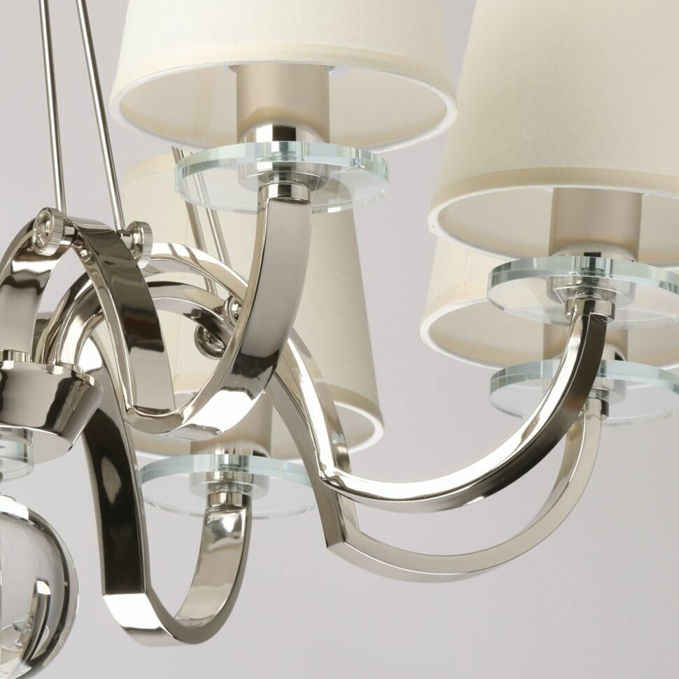 Классический дизайн сохраняет свою актуальность. Цвет хрома придает люстре современности. Текстильные абажуры создают мягкое комфортное освещение. Хрустальный декор поддерживает роскошь и статус люстры. Заменяемые источники света удобны в эксплуатации. Возможность регулировать комфортную высоту. Металлическое основание светильника гальванизировано в цвет хрома. Источники света закрыты белыми текстильными абажурами с термостойким акрилом внутри. Светильник декорирован розетками и сферой из прозрачного массива хрусталя.