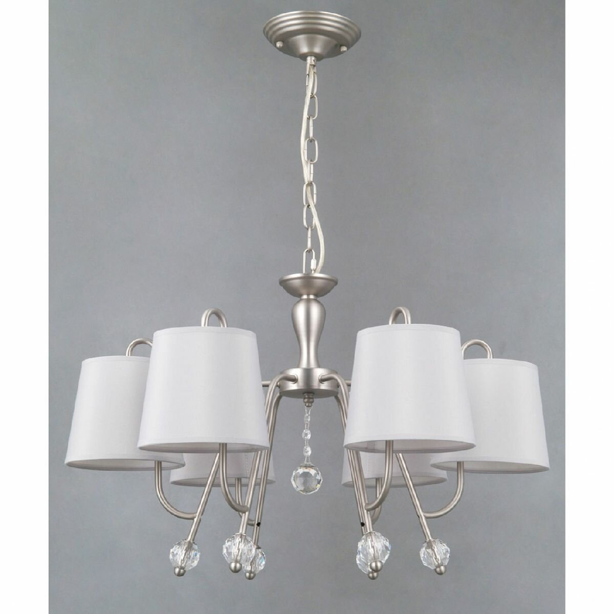 Металлическое основание подвесной люстры окрашено в цвет перламутрового серебра. Заменяемые источники света закрыты текстильными абажурами серого цвета. С внутренней стороны текстиль защищен прозрачным термостойким акрилом. Абажуры отделаны кантами и прошиты. Люстра декорирована прозрачным хрусталем.