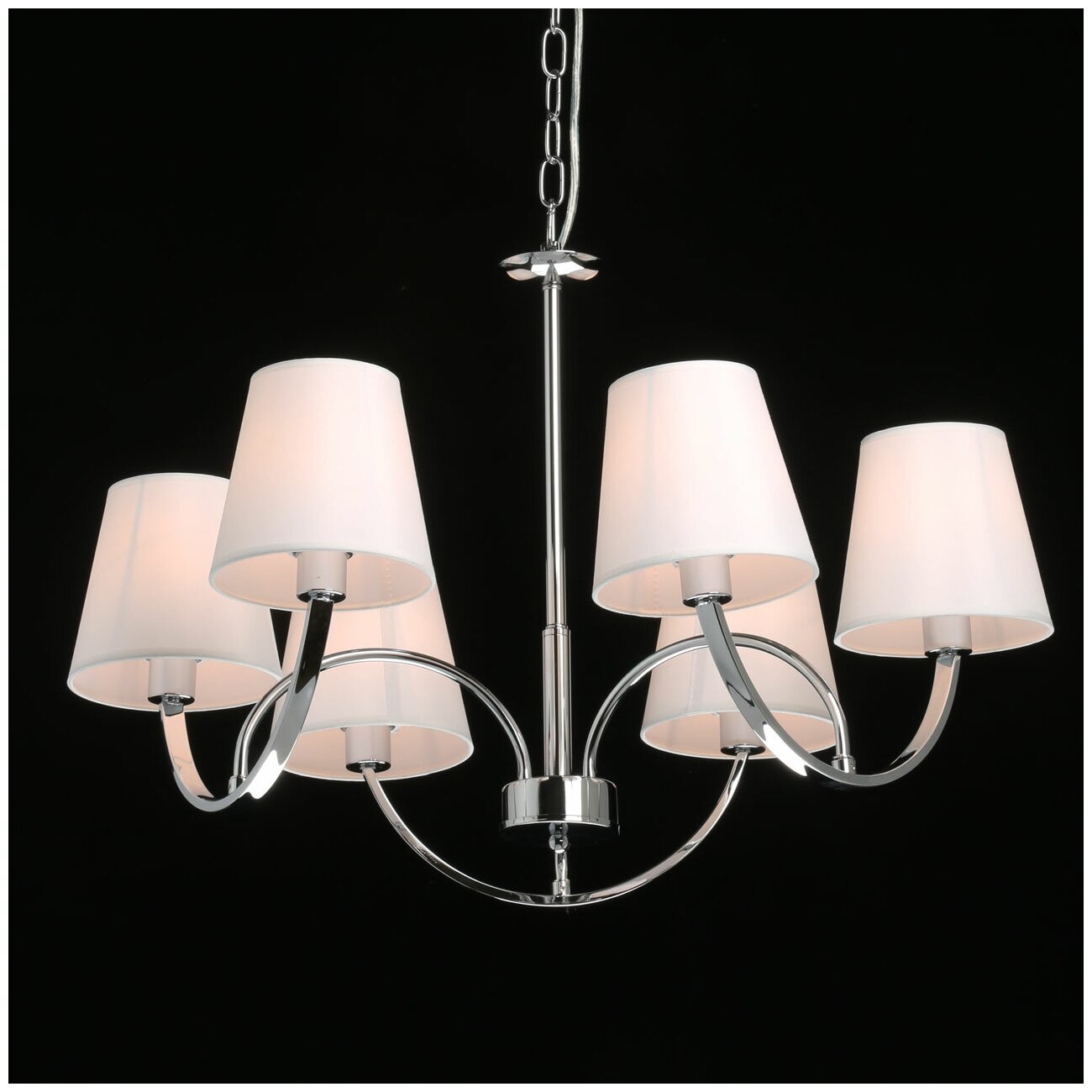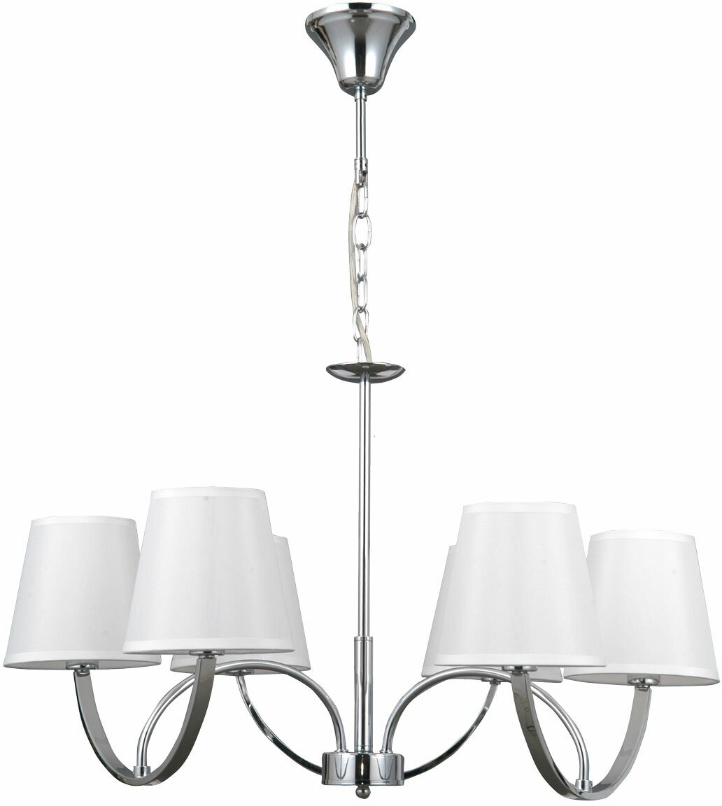 Металлическое основание подвесной люстры гальванизировано в цвет хрома. Люстра декорирована двухслойными текстильными абажурами белого цвета с термостойким акрилом внутри. Абажуры отделаны кантами сверху и снизу и прошиты.