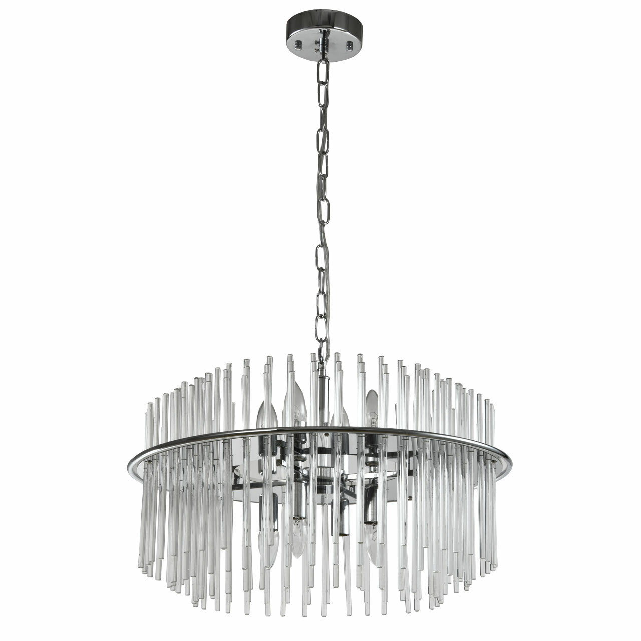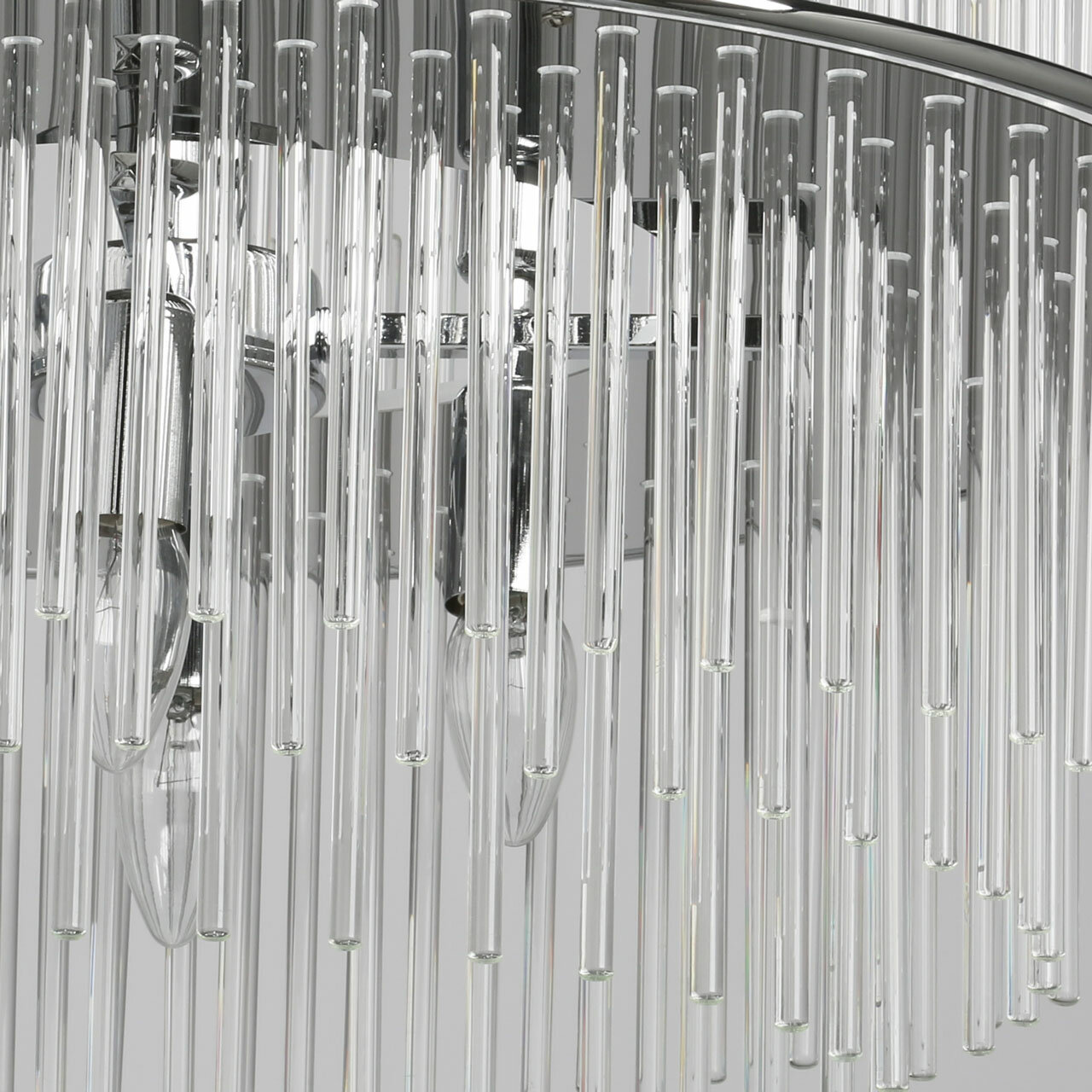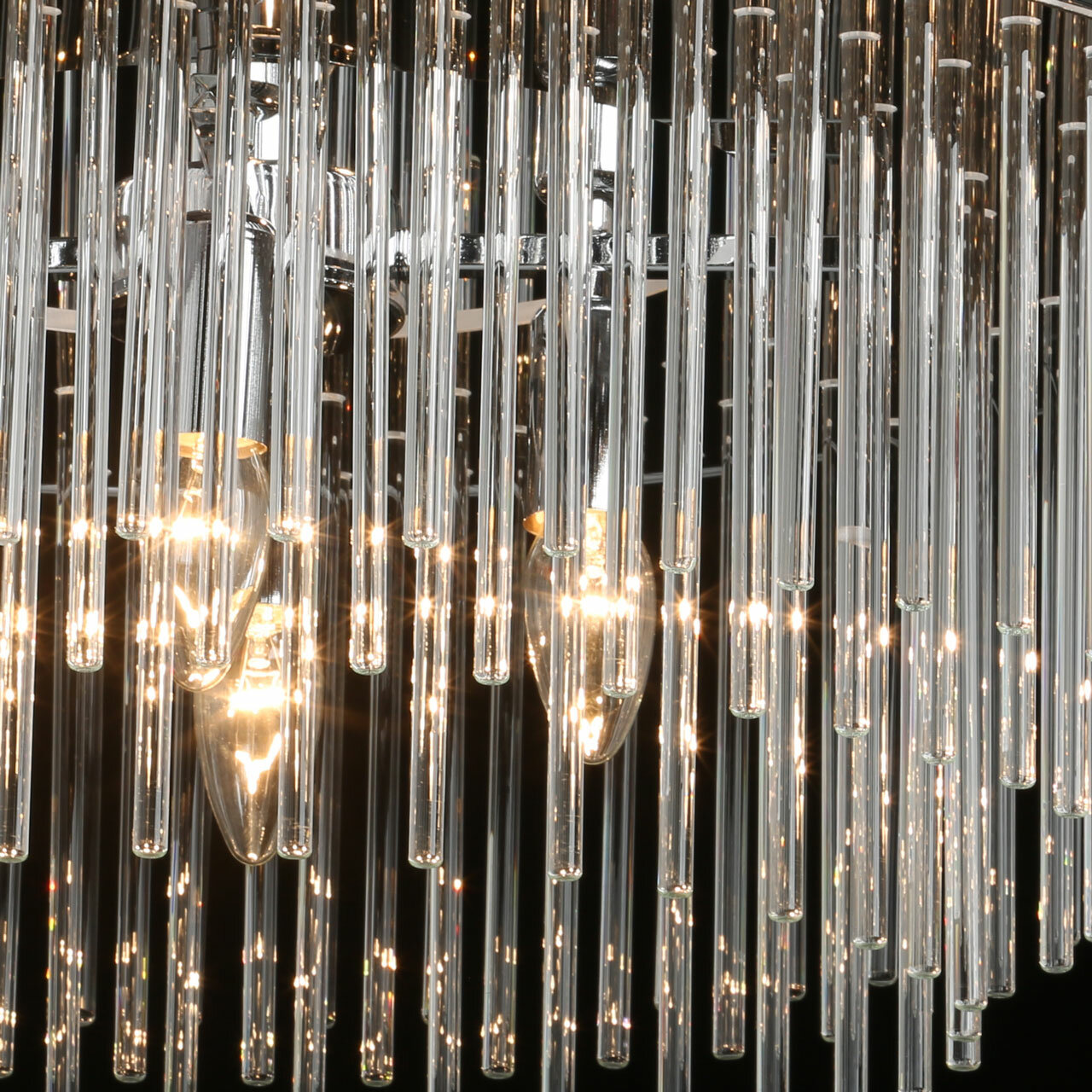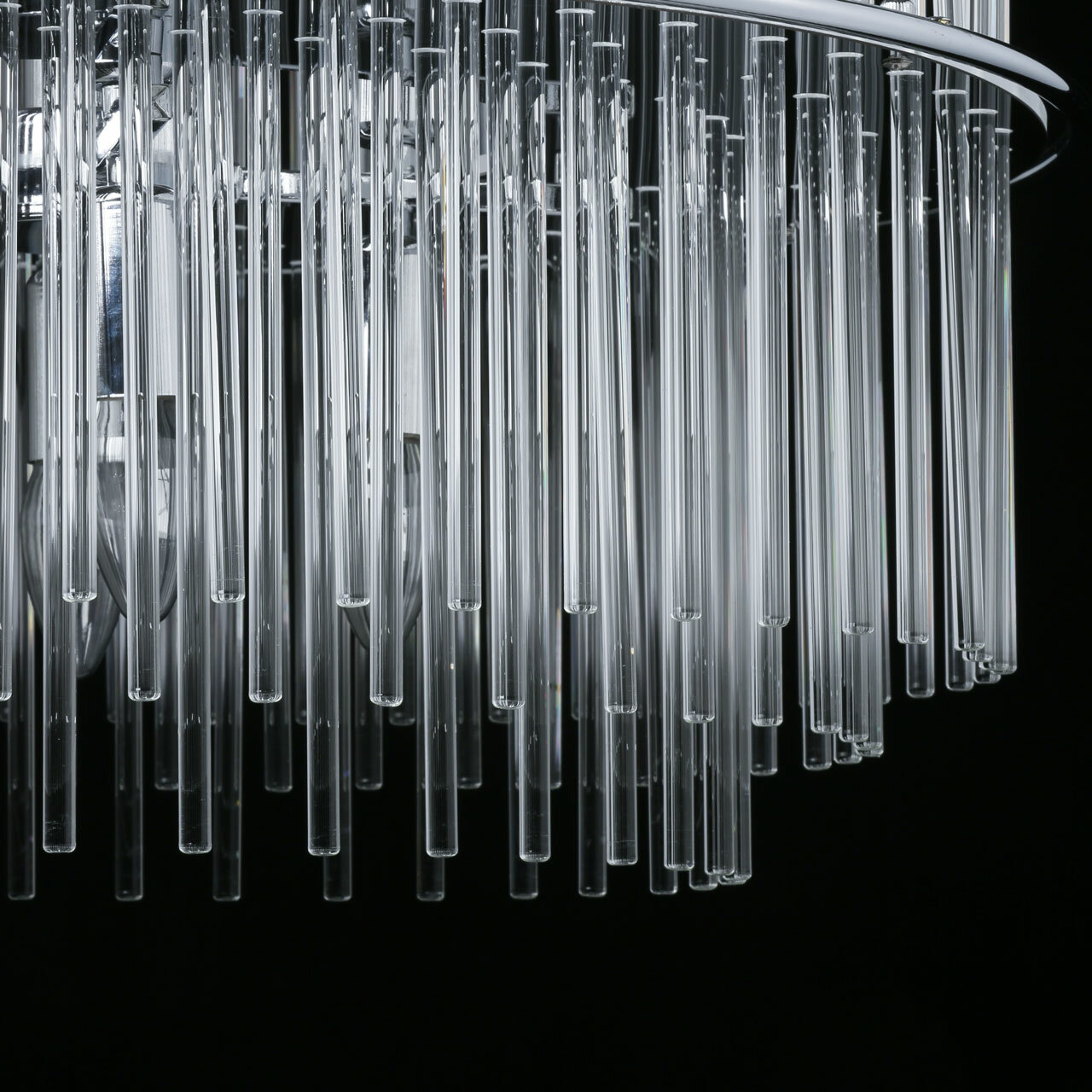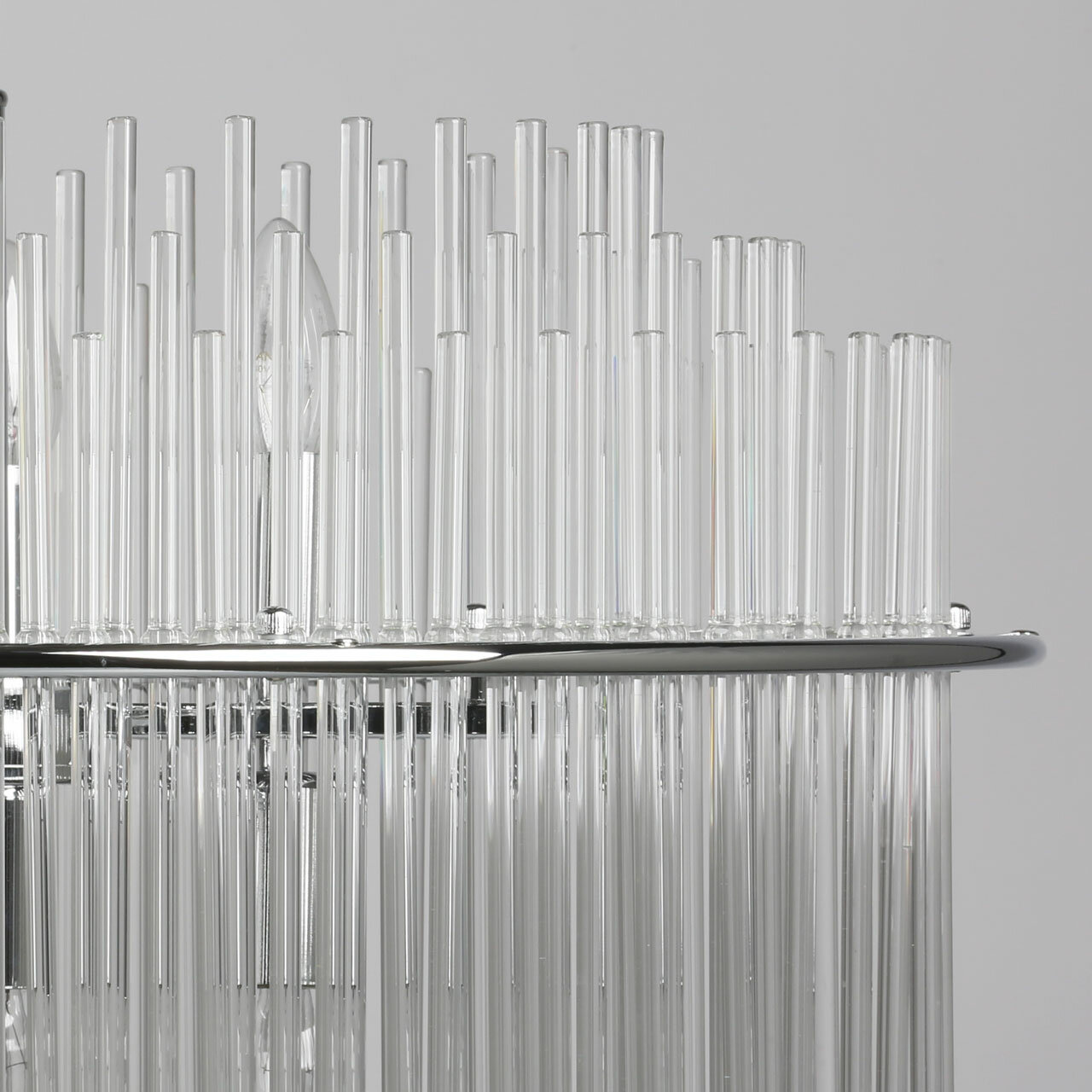 Металлическое основание светильника гальванизировано в цвет хрома. Светильник декорирован прозрачным стеклом в виде трубочек. Стеклянный декор крепится на пластину из нержавеющей стали, отполированной до зеркального блеска.