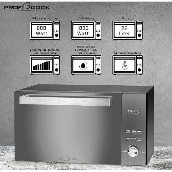 Микроволновая печь Profi Cook schwarz предназначена для разогрева, размораживания и приготовления продуктов в частных домах, квартирах, отелях и офисах. Особенности Для быстрого разогрева используйте микроволновую печь мощностью 800 Вт. Для приготовления вкусных блюд на гриле и золотисто-коричневых угощений используется мощный гриль мощностью 1000 Вт. Изюминка — Специальная технология Power Boost обеспечивает концентрированную мощность микроволновой печи на высококачественном стекло-керамическом полу Easy Clean. Кроме того, микроволновая печь занимает на 55% большую полезную площадь за счет отсутствия поворотного стола. Таким образом, квадратные тарелки или формы для запекания также идеально впишутся в прибор. Лучшие характеристики — выделяется своей зеркальной стеклянной передней панелью и современным внешним видом. Микроволновая печь ProfiCook оснащена таймером на 60 минут и функцией таймера (до 24 часов вперед). Когда ваше блюдо будет готово, раздастся звуковой сигнал, предупреждающий вас, если вы не будете находиться рядом с микроволновой печью. Многофункциональный дисплей с цифровыми часами информирует вас о текущем времени, а также о времени, оставшемся до разогрева или приготовления пищи на гриле. Конечно, устройство также оснащено родительским контролем. Выбор программ — Выберите подходящую для ваших нужд из 8 программ автоматического приготовления, 5 уровней мощности микроволновой печи и одной ступени гриля. С помощью 3 доступных программ размораживания замороженные продукты можно равномерно и быстро разморозить для дальнейшего использования. Кроме того, вы также можете комбинировать гриль и микроволновую печь.